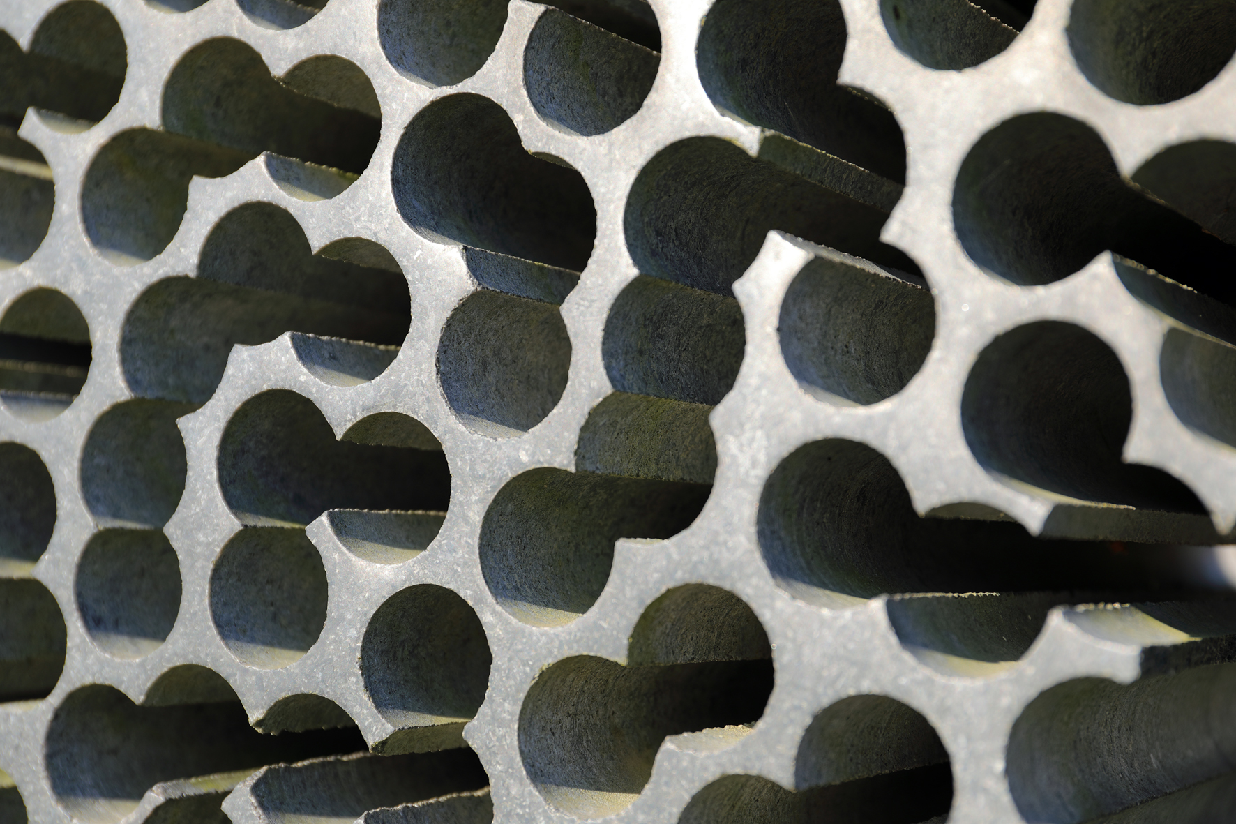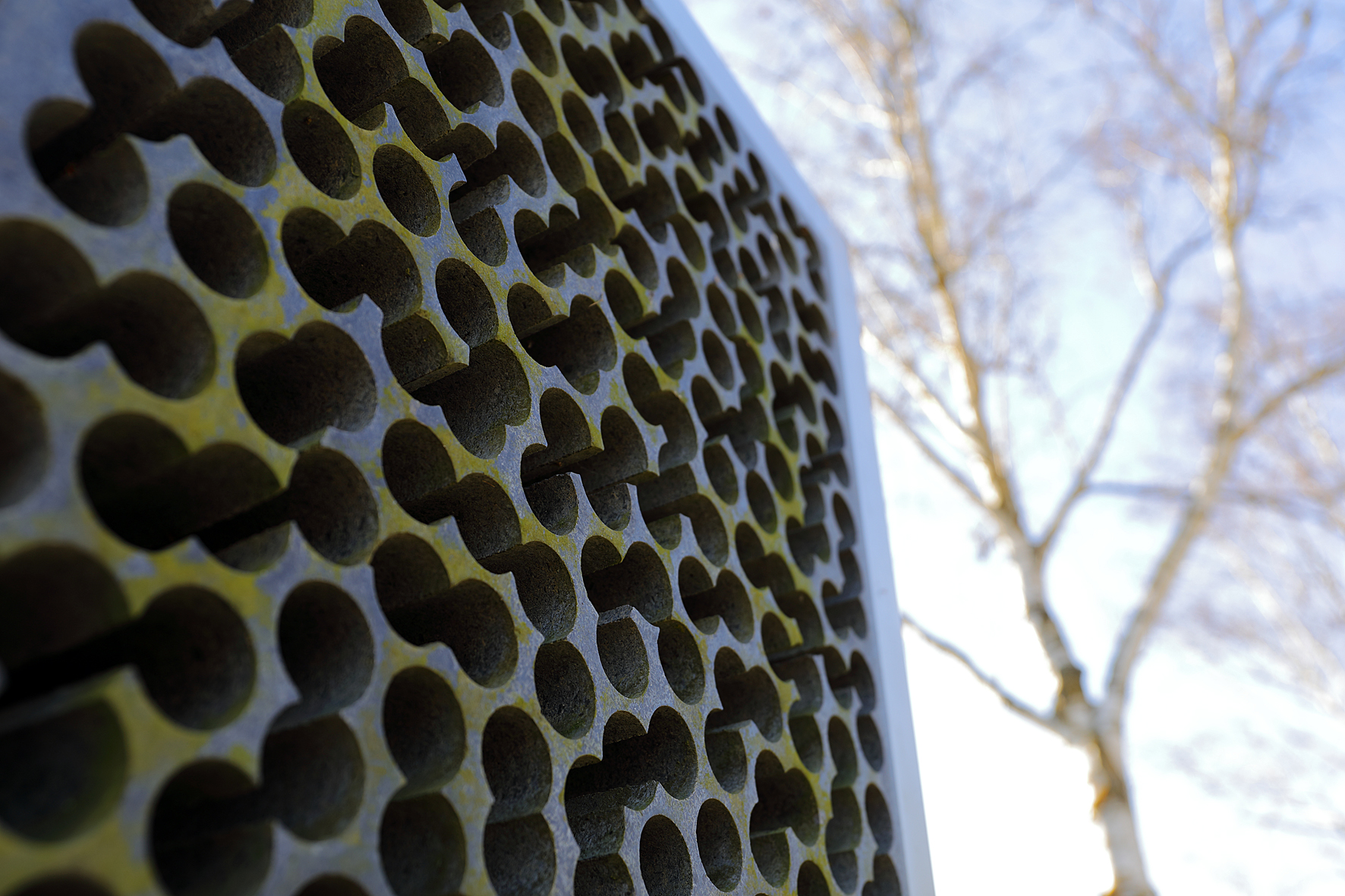 Der "Stein für das Licht" von Kubach & Kropp ist ein massiver Steinquader, der mittels dicht gesetzter serieller Bohrungen die Geschlossenheit des Granits auflöst. Es bleibt nur noch ein netzartiges Gefüge aus schmalen Stegen stehen, so, dass das Licht in den Stein hinein und durch ihn hindurch scheinen kann.