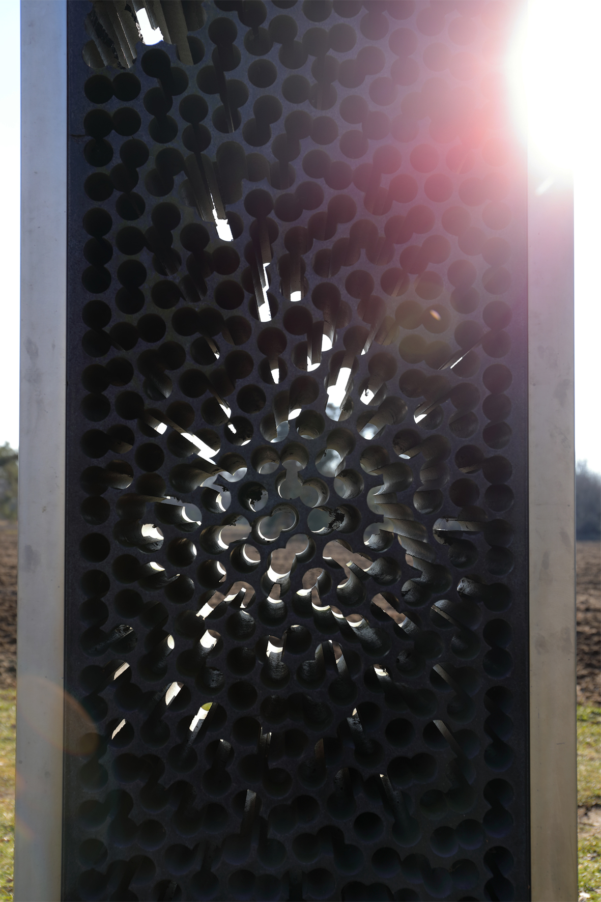 Wie ein Gitter aus molekularen Strukturen setzt sich das schwarze Rechteck gegen den blauen Himmel ab. Gravitätisch, und doch leicht und transparent, ist der "Stein für das Licht“ zwischen Himmel und Erde eingespannt.