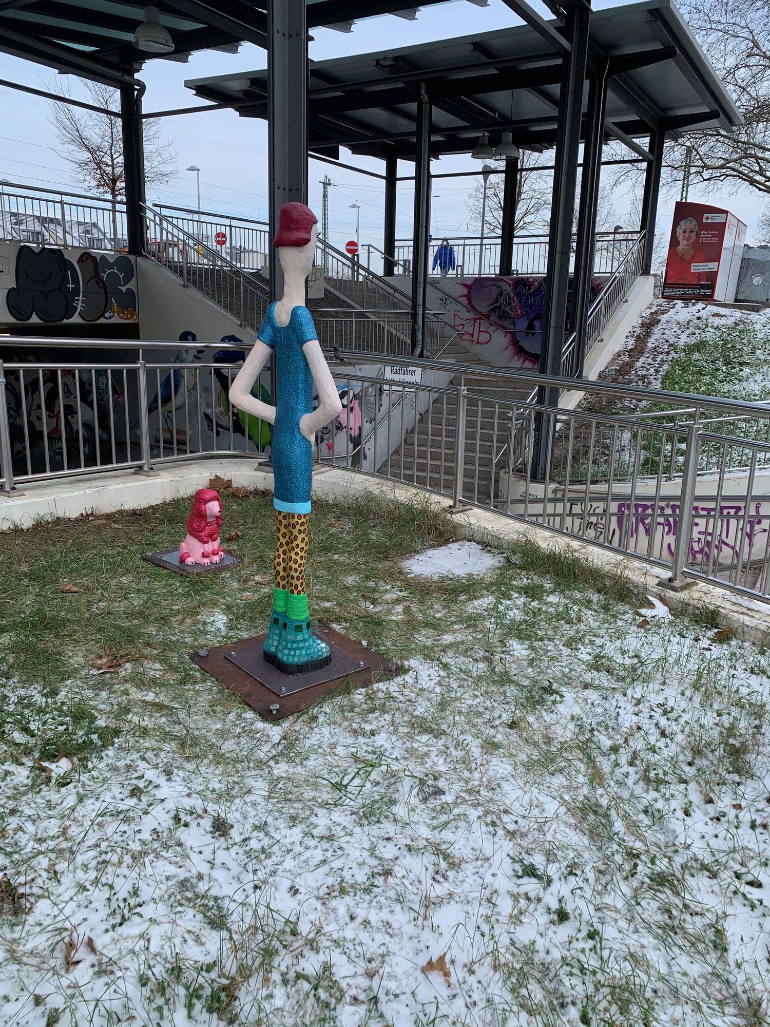 Seit 10. Februar 2021 wandert eine Frau mit Pudel durch Mörfelden-Walldorf. Nachdem sie zuerst am Bahnhof Mörfelden stand, tauchte sie an der katholischen Kirche Walldorf, im Feld zwischen Mörfelden und Walldorf, am Rathaus Mörfelden, an der Stadthalle Walldorf und im Rosengärtchen Mörfelden auf.