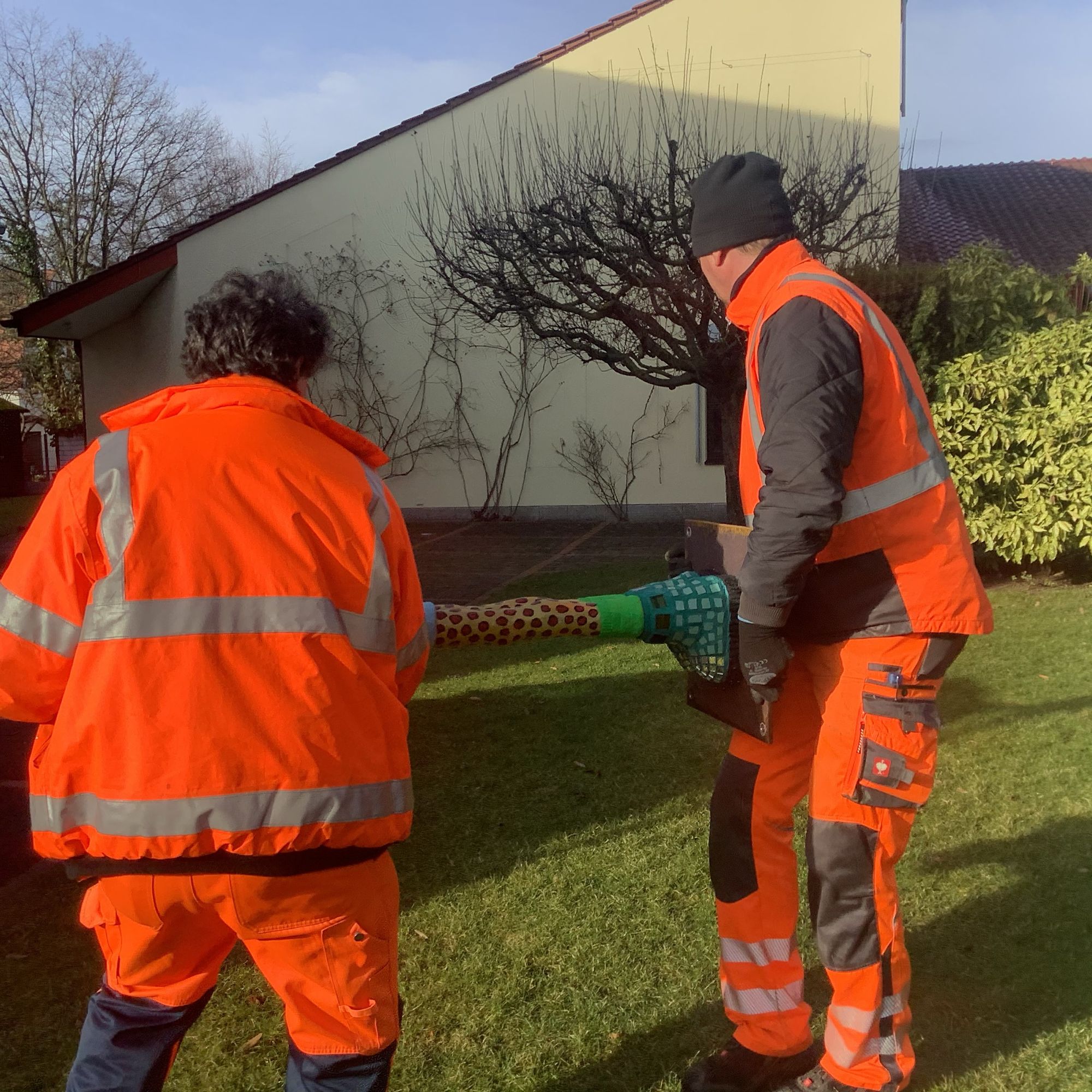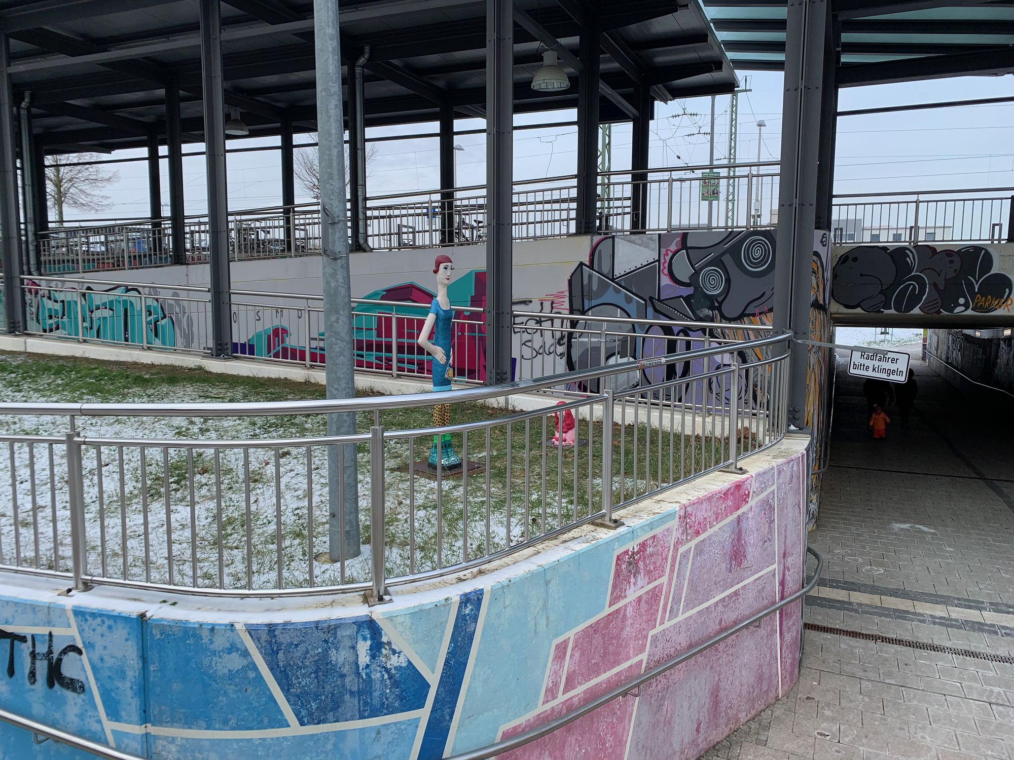 In Zeiten der Pandemie haben wir nach einer alternativen Ausstellungsform gesucht und uns von der aus dem Nichts aufgetauchten Stele in der Wüste von Arizona inspirieren lassen. Ohne eine Ankündigung sollte eine Arbeit im Stadtgebiet von Mörfelden-Walldorf erscheinen und auch wieder verschwinden. In den weiteren Überlegungen haben wir beschlossen, die Figur an verschiedenen Orten der Stadt erscheinen zu lassen, sie sozusagen durch die Stadt wandern zu lassen.
