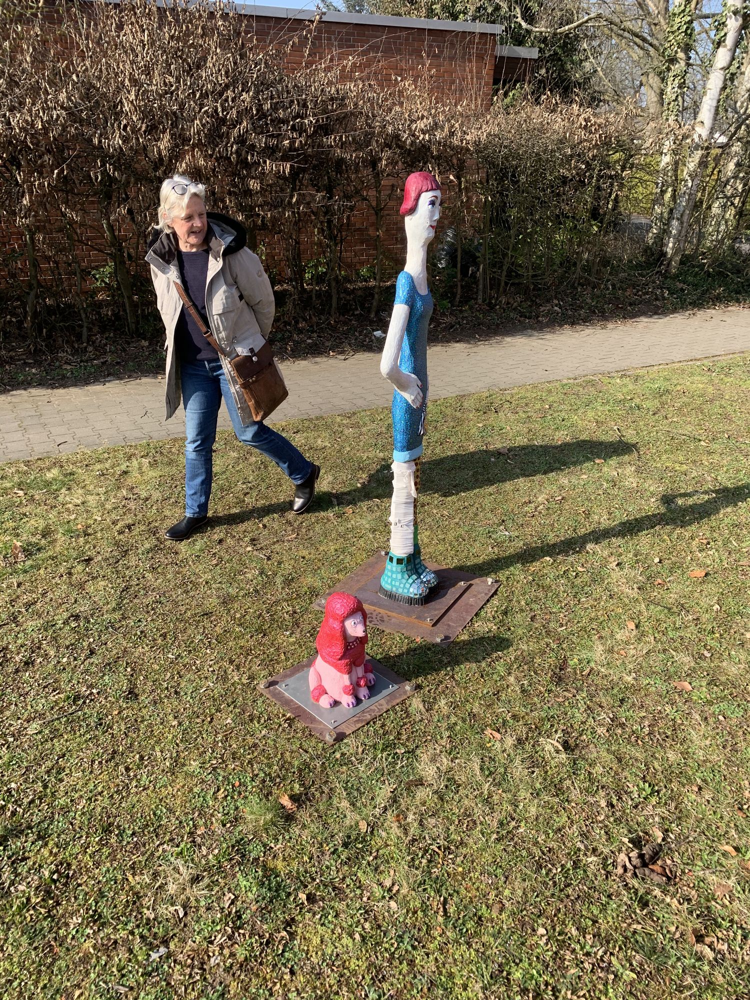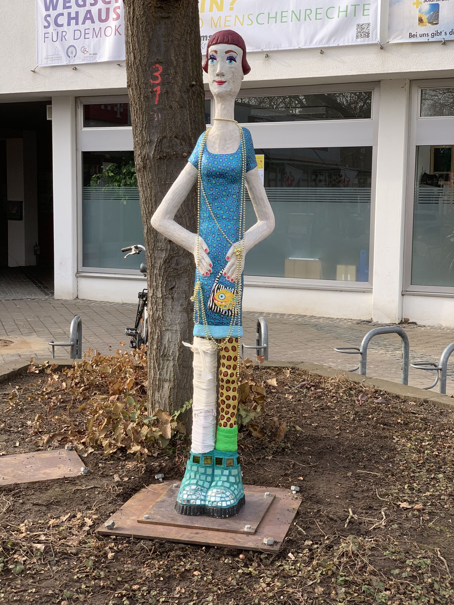 An der dritten Station wurde unserer Spaziergängerin nicht nur eine Kette geschenkt. Leider ist einem Besucher offenbar ein Unglück passiert und die Figur wurde leicht beschädigt. Der Beinbruch konnte ambulant versorgt werden, so dass die Dame anschließend nun mit einem Verband durch die Stadt wandelt.