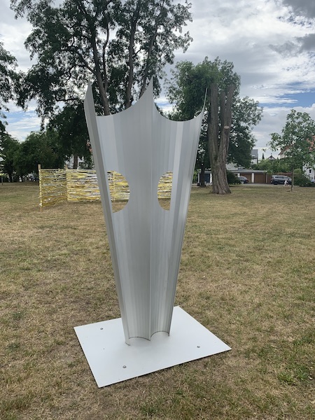 Für die Form habe ich ein Werkzeug benutzt, das Sie kennen. Eine Stichsäge! Mit einer sogenannten Abkantbank habe ich die unterschiedlichen Winkel, die zu der Drehung des Bleches führen, geknickt. Das Werk stahlt Kühle und Präzision aus. Auf den ersten Blick wirkt die Plastik abstrakt. Wenn man etwas seitlich dazu steht, könnte man an eine Blüte denken. Frontal betrachtet klingt die Verwandtschaft zu einem Bustier an. Hier ist keine Persönlichkeit sondern das Weibliche als Prinzip geehrt worden.