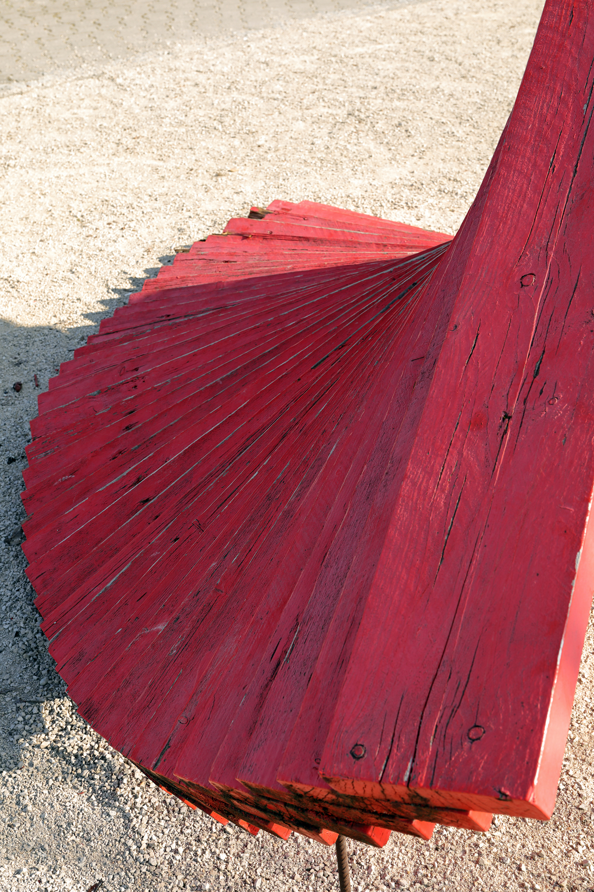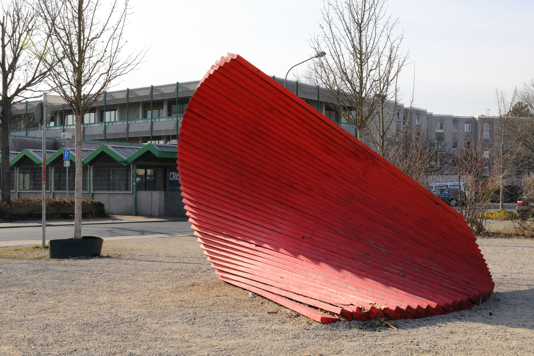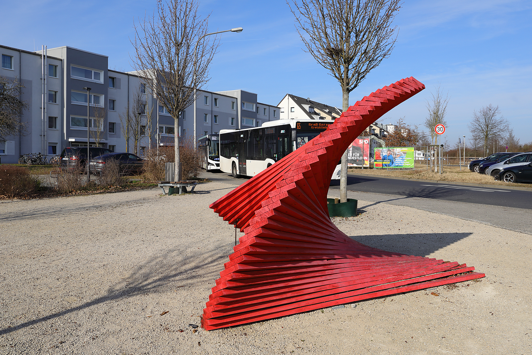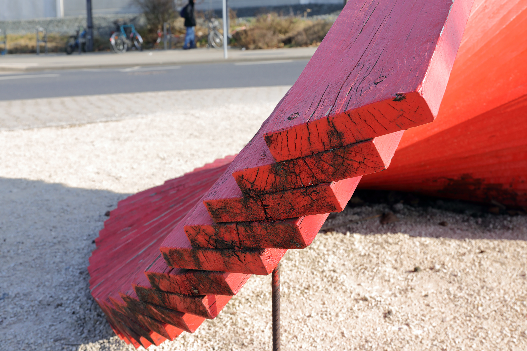 Der 1960 in Mönchengladbach geborene Künstler lebt seit 1987 in der Schweiz. Er studierte an den Hochschulen für Gestaltung und Kunst in Zürich und Luzern. Schroeteler arbeitet mit einfachen Materialien. Die Arbeit "Drehung 113° zeigt ein wie ein Fächer aufgespanntes Objekt, das aus zum Teil in signalroter Holzschutzfarbe gestrichenen Holzlatten besteht „Die Schalen konstituieren einen begehbaren Raum“, schreibt der Künstler dazu.