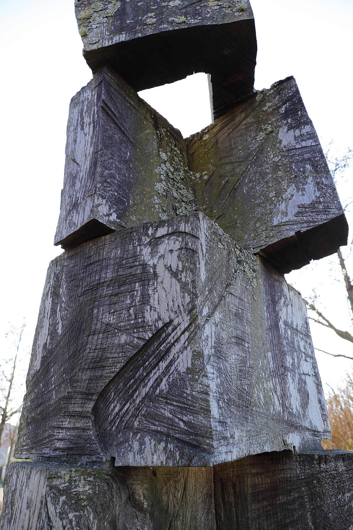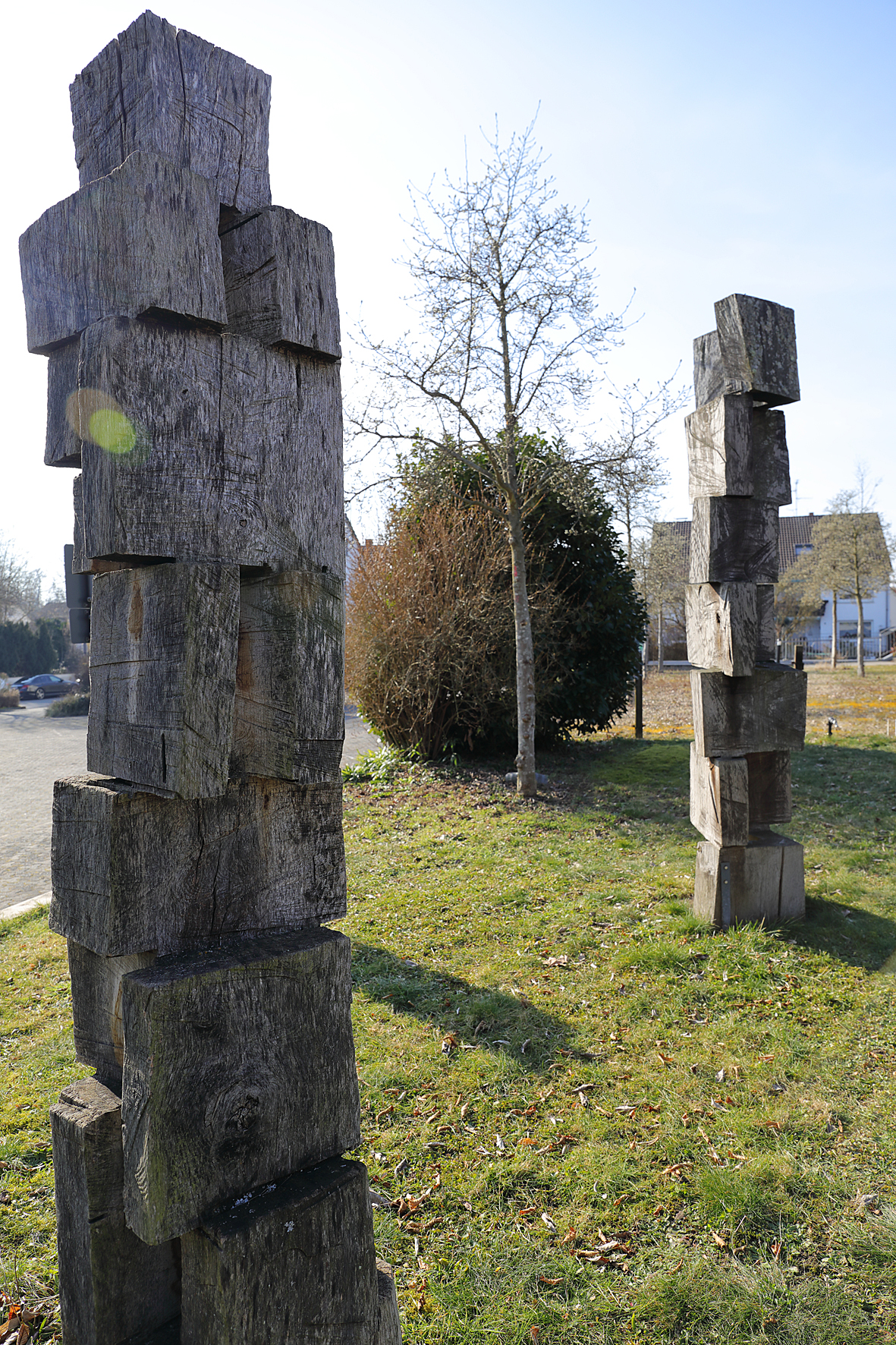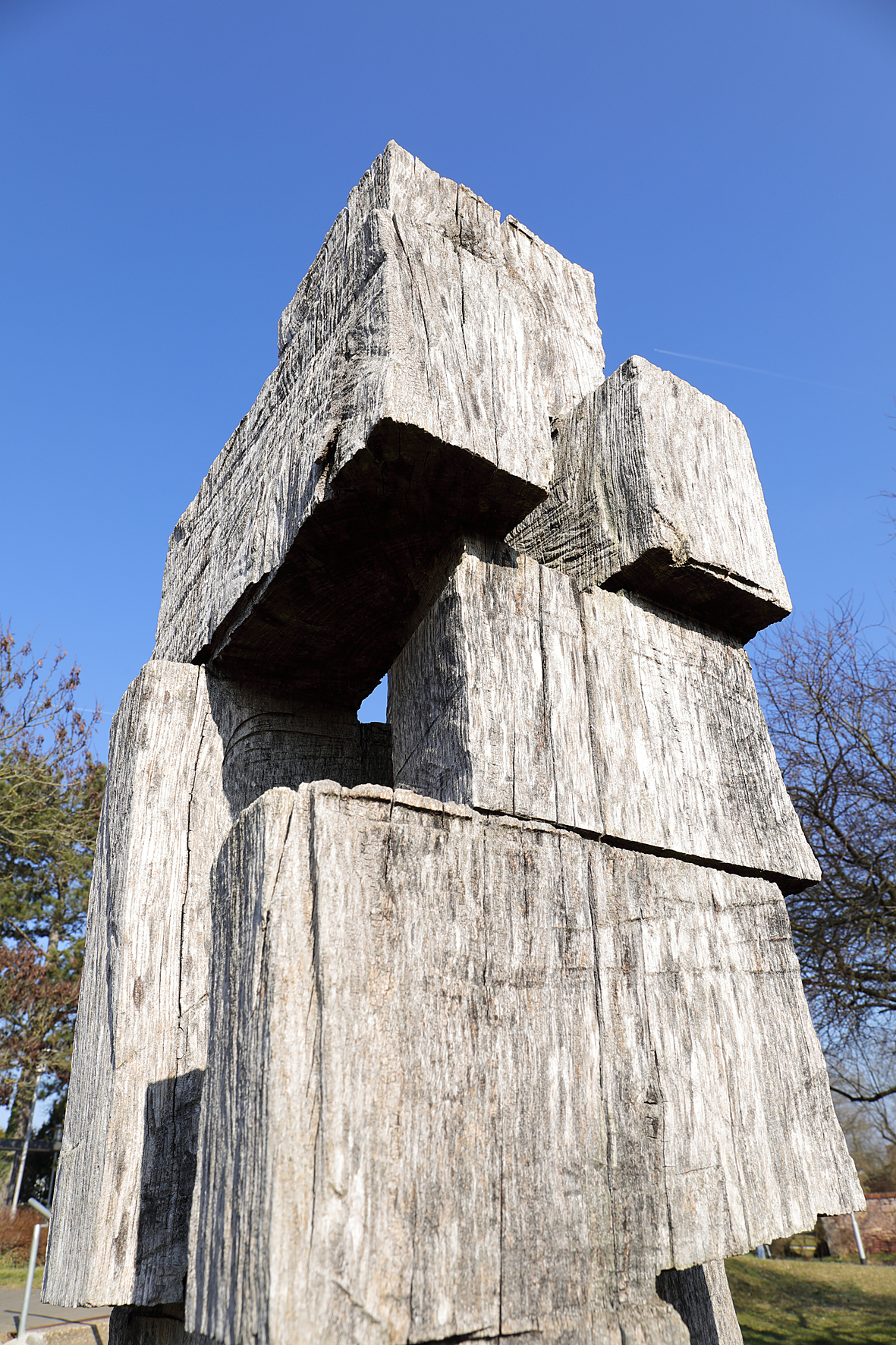 Mein bevorzugtes Material für meine Skulpturen ist Holz, dessen natürliche Qualität, Farbe und Textur ich für meinen künstlerischen Ausdruck verwende. Mit meiner geplanten puristischen Arbeitsweise arbeite ich die Skulpturen mit der Kettensäge zu Gruppen, Stapeln und Anordnungen von Würfeln und Quader. Meine Skulpturen sind geometrische Konstruktionen aus horizontalen und vertikalen Ordnungen, Wiederholungen und Serien, die auf einem strukturierten Denkprozess basieren. Die Skulpturen bestehen immer aus einem ganzen Stamm (aus dem Portfolio der Künstlerin).