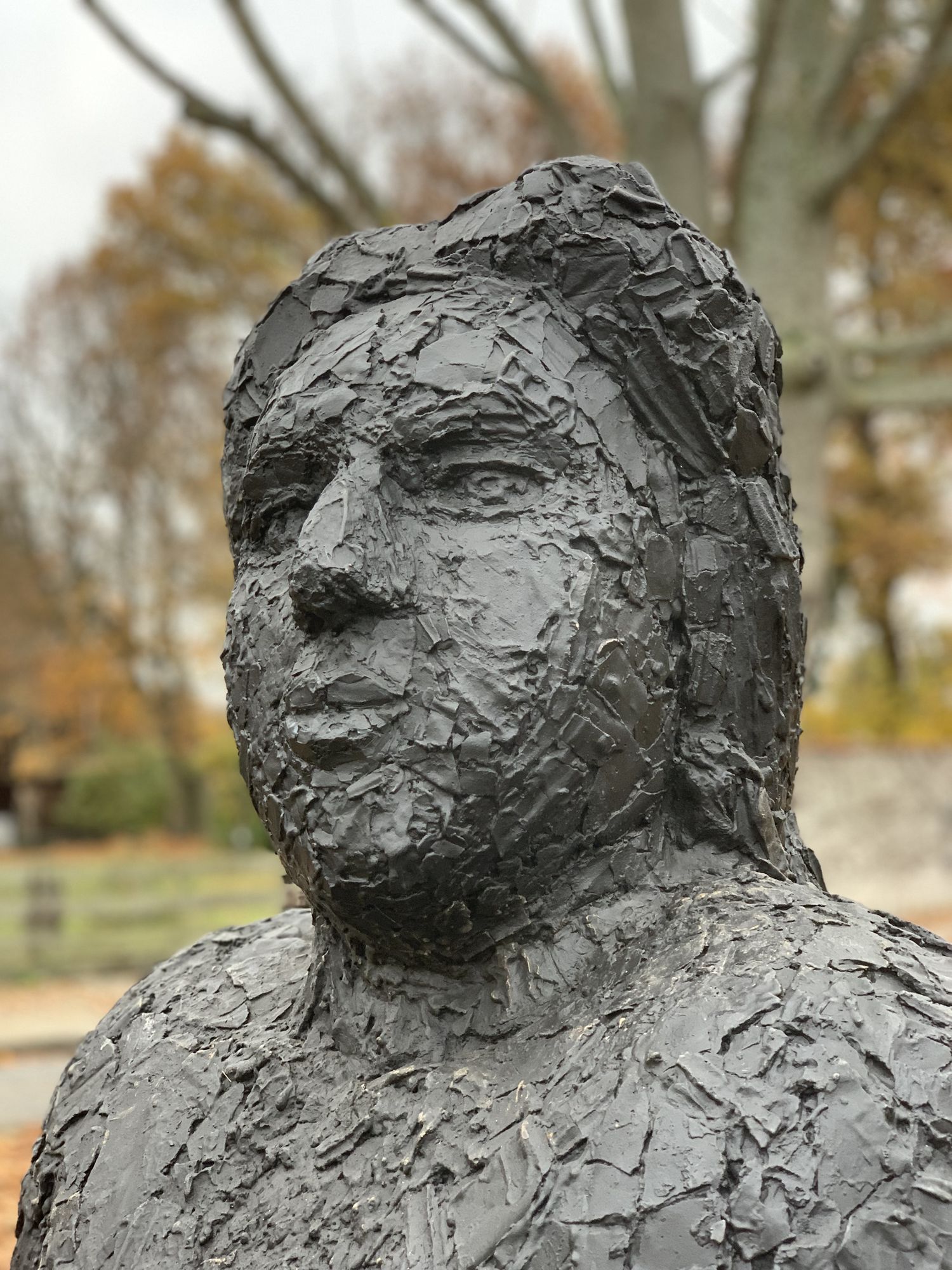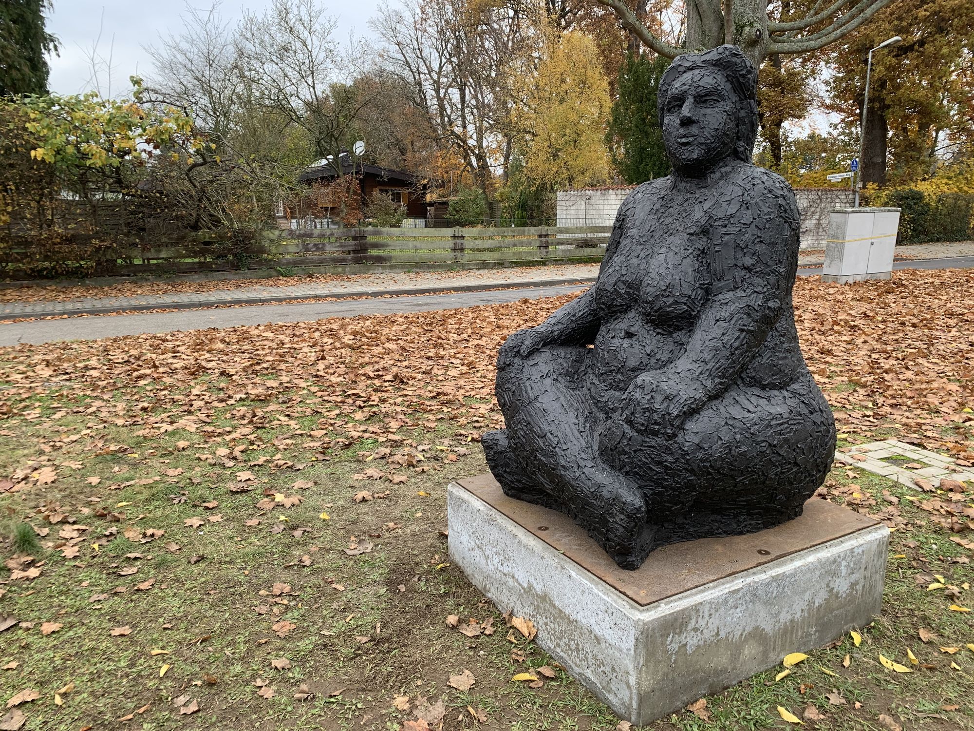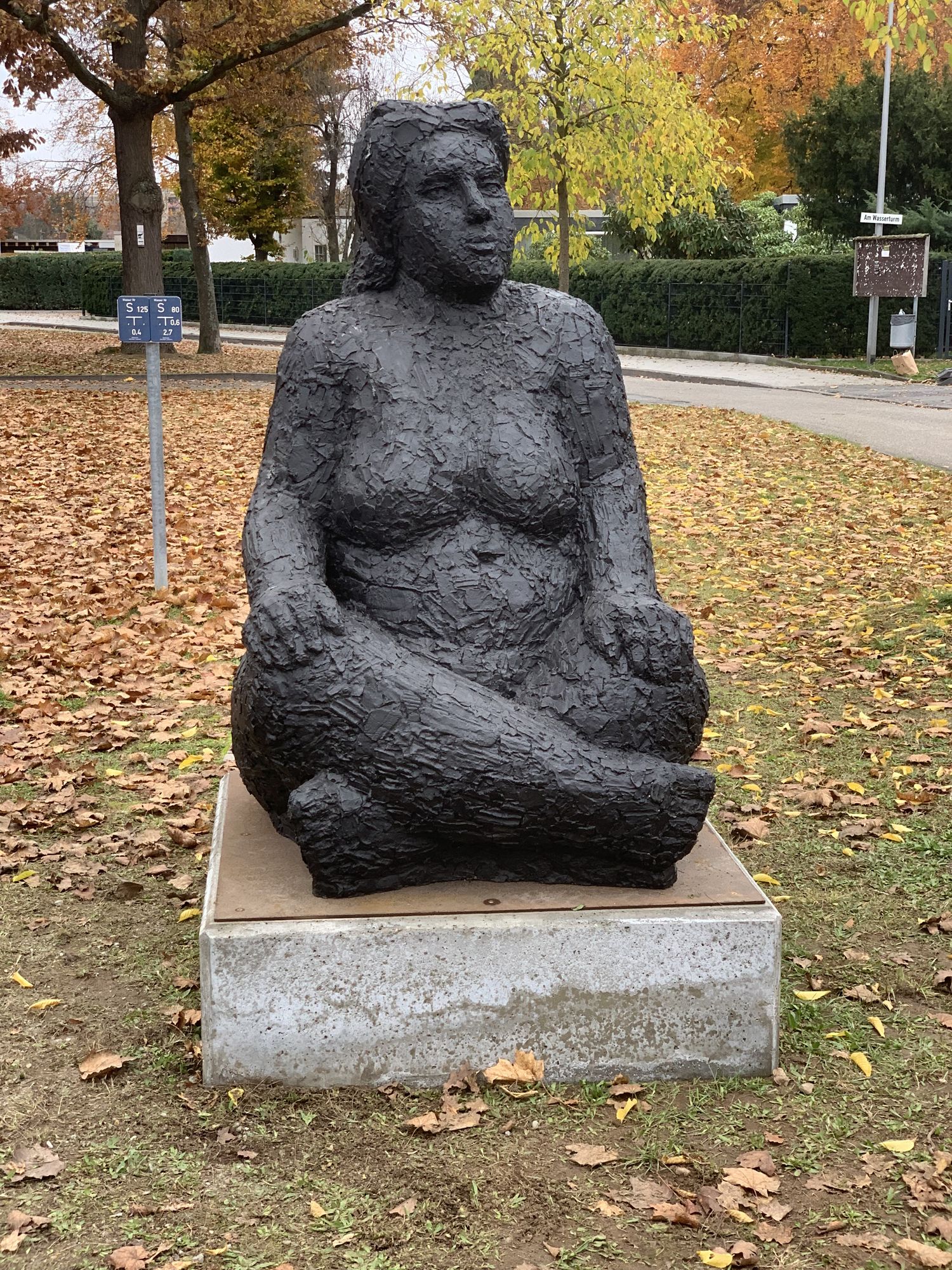 2017 war es wieder so weit: Ich entschloss mich, eine große Skulptur zu bauen. Der Anlass: Ich bin 1939 geboren und also im 80. Lebensjahr. lm Januar machte ich mich an die Arbeit. Es entstand erst ein kleines Modell. Das große Modell sollte die Maße 165 x 105 x 105 cm haben, überlebensgroß und für den öffentlichen Raum bestimmt sein. Über ein Eisengerüst baute ich einen Kern aus Styropor, trug Gipsplatten mit flüssigem Gips auf. Es waren viele Zentner Material, ich schlug mit dem Beil oft einiges weg, baute geduldig wieder auf, und nach fünf Monate langem Ringen entschied ich: Die Arbeit ist fertig. DerTitel: Große Frau - ein Fels. Es gab keine andere Wahl, die Form musste gegossen werden. Um sie aus dem Atelier herauszubringen, wurde sie an Ort und Stelle von meinem Former im Atelier an mehreren Tagen in Silikon abgeformt. Anschließend entstand in der Gießerei ein Wachsmodell, das von mir retuschiert wurde. Sechs Teile wurden in einer Gips-Schamott-Mischung eingeformt, ausgeschmolzen und tagelang im Ofen getrocknet. Viele Zentner Bronze verbrauchte die getrocknete Form. Nach dem Auspacken und Abstrahlen wurden die Teile sauber zusammengeschweißt, anschließend tiefschwarz patiniert.