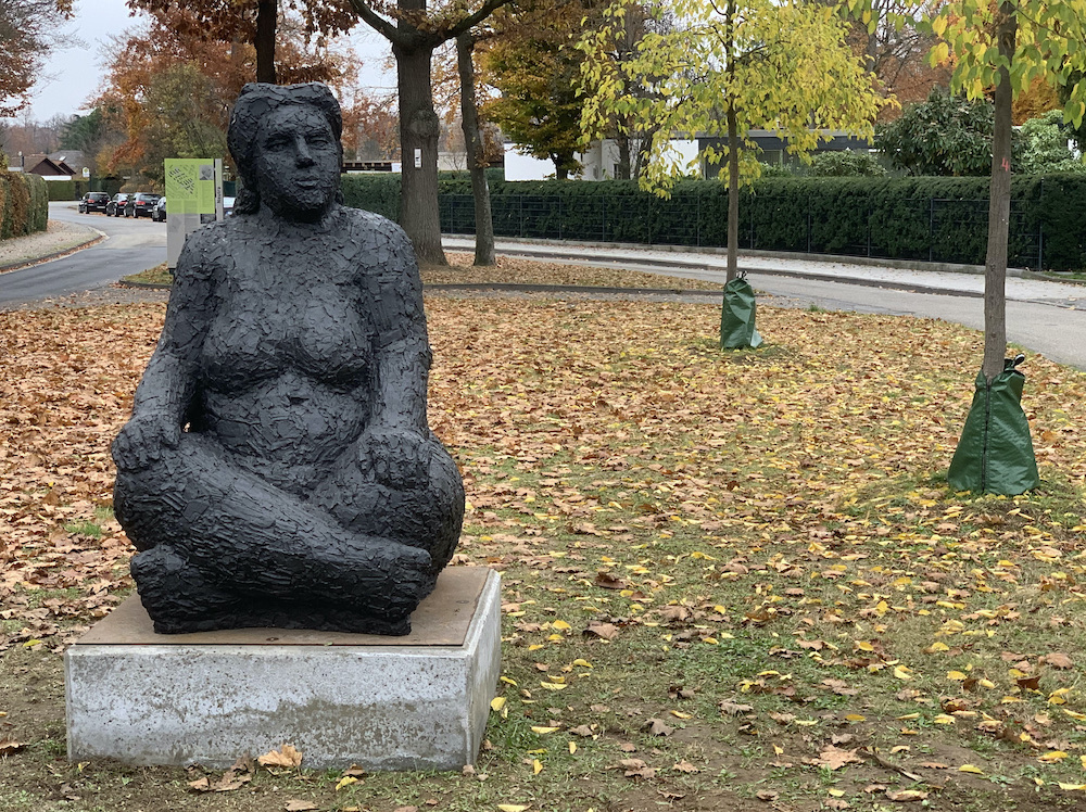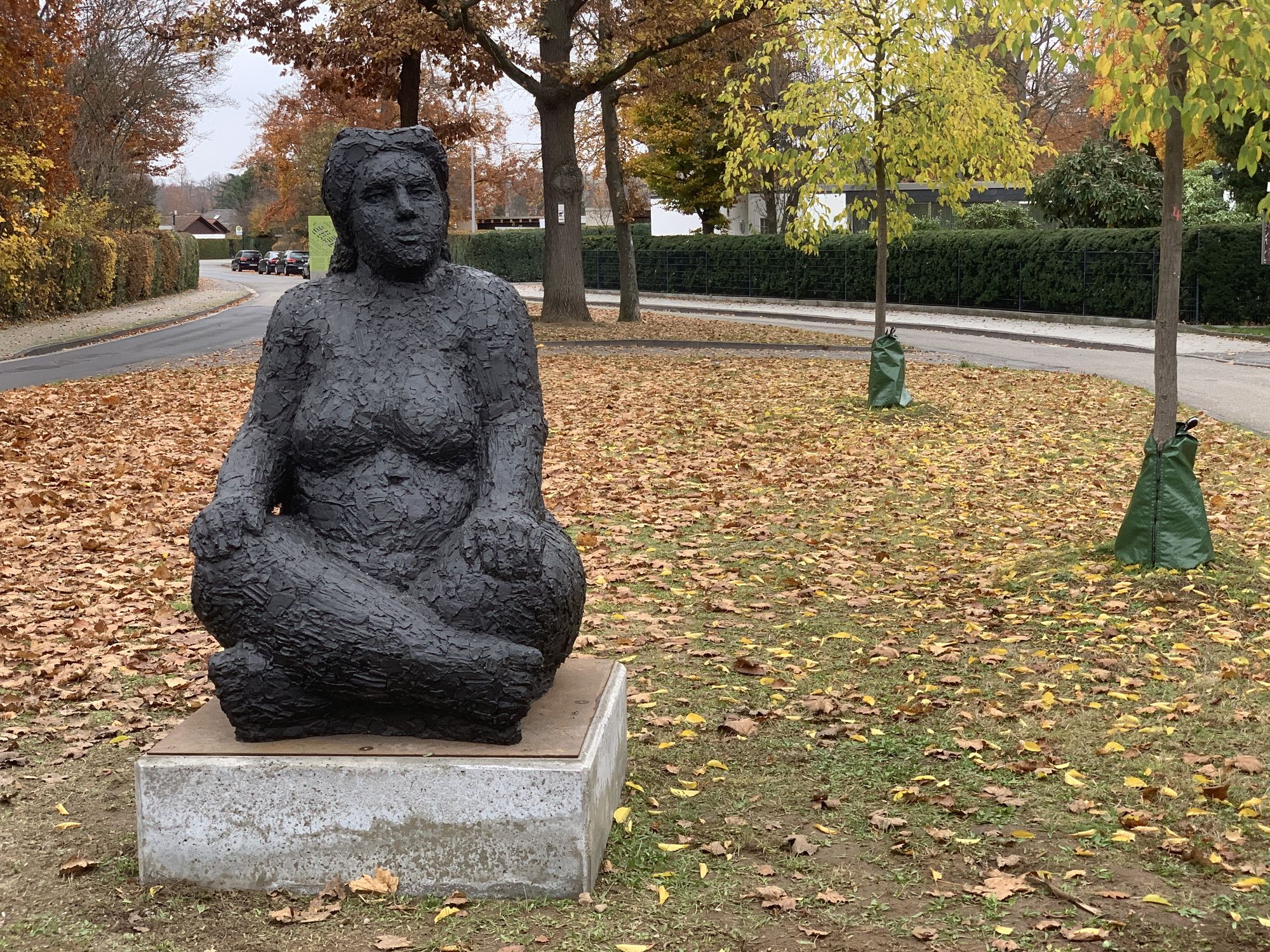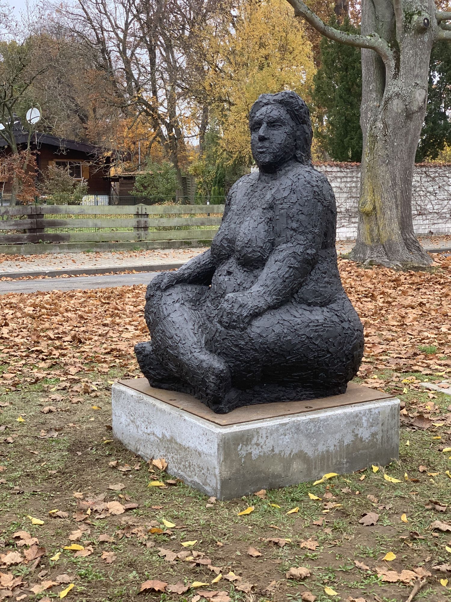 2017 war es wieder so weit: Ich entschloss mich, eine große Skulptur zu bauen. Der Anlass: Ich bin 1939 geboren und also im 80. Lebensjahr. lm Januar machte ich mich an die Arbeit. Es entstand erst ein kleines Modell. Das große Modell sollte die Maße 165 x 105 x 105 cm haben, überlebensgroß und für den öffentlichen Raum bestimmt sein. Über ein Eisengerüst baute ich einen Kern aus Styropor, trug Gipsplatten mit flüssigem Gips auf. Es waren viele Zentner Material, ich schlug mit dem Beil oft einiges weg, baute geduldig wieder auf, und nach fünf Monate langem Ringen entschied ich: Die Arbeit ist fertig. DerTitel: Große Frau - ein Fels. Es gab keine andere Wahl, die Form musste gegossen werden. Um sie aus dem Atelier herauszubringen, wurde sie an Ort und Stelle von meinem Former im Atelier an mehreren Tagen in Silikon abgeformt. Anschließend entstand in der Gießerei ein Wachsmodell, das von mir retuschiert wurde. Sechs Teile wurden in einer Gips-Schamott-Mischung eingeformt, ausgeschmolzen und tagelang im Ofen getrocknet. Viele Zentner Bronze verbrauchte die getrocknete Form. Nach dem Auspacken und Abstrahlen wurden die Teile sauber zusammengeschweißt, anschließend tiefschwarz patiniert.
