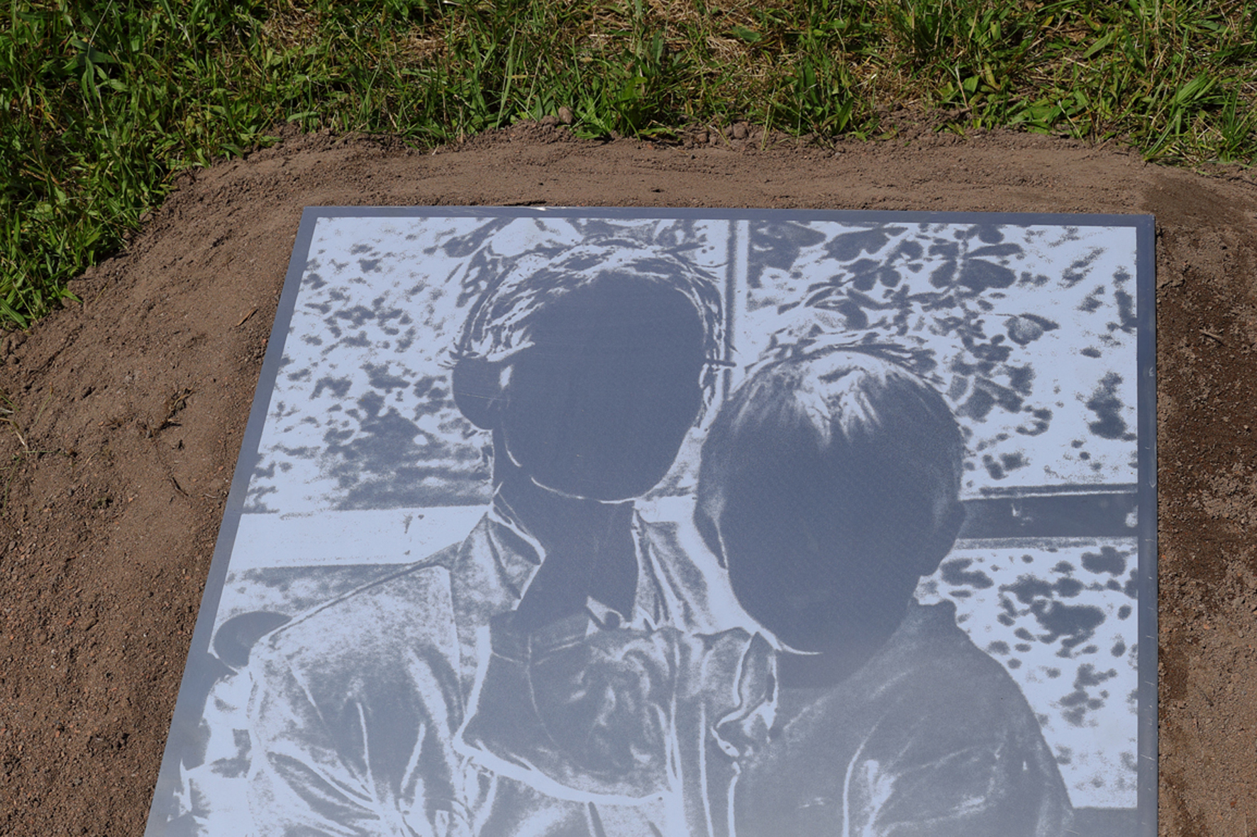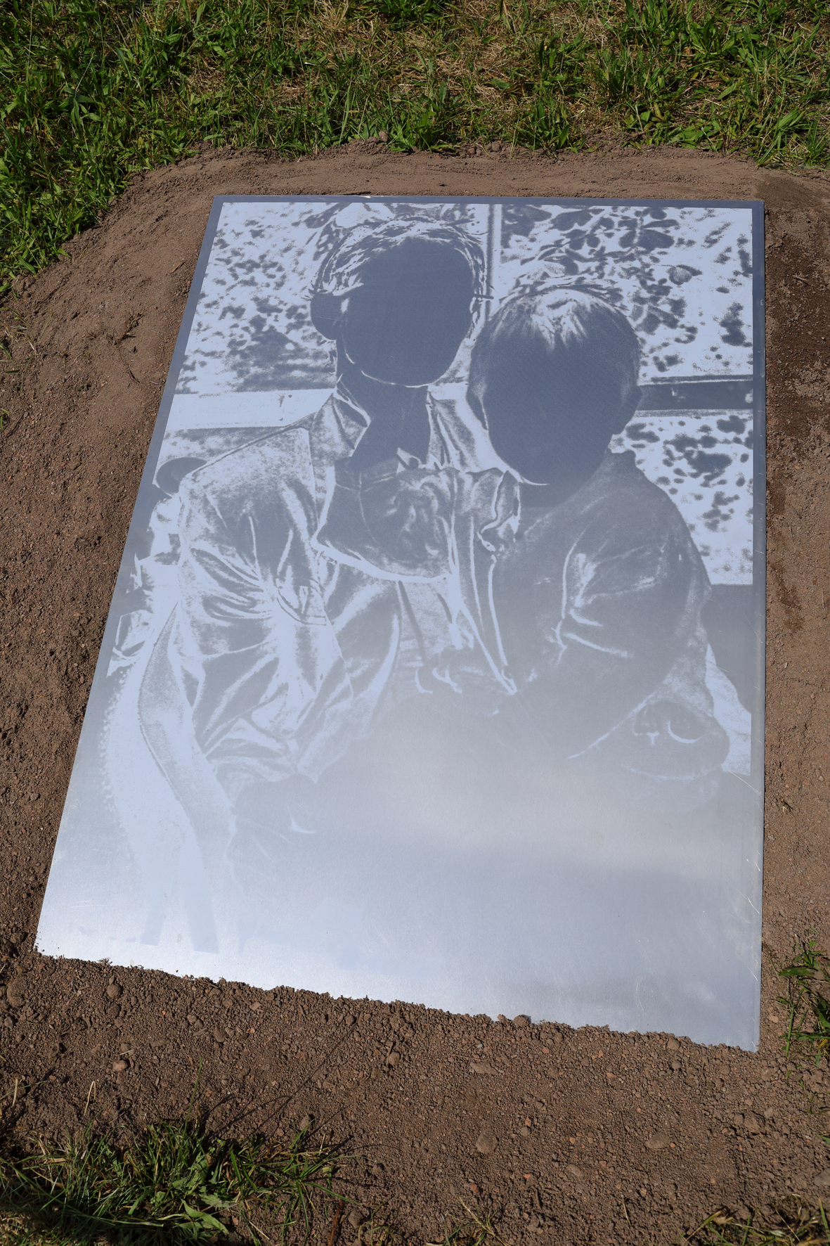 Das Werk Stütze stellt durch eine Verbindung zwischen zwei Fotografien eine Verbindung zwischen zwei Skulpturen her: Die eine Fotografie zeigt meine Mutter, wie sie ihre 1984 fertiggestellte Stahlskulptur, eine abstrahierte, menschliche Figur, die gleichzeitig an ein Messer erinnert, probeweise aufstellt und mit der Hand stützt. Die andere Fotografie zeigt mich als Kind, wie ich den Kopf meiner Mutter mit meiner Hand stütze. Vierzig Jahre nach der Fertigstellung der Stahlskulptur meiner Mutter bringe ich einen Siebdruck des zweiten Fotos auf Aluminium am Fuß der Skulptur an, um unserer komplexen Mutter-Tochter-Beziehung Rechnung zu tragen. Aufgrund der Überbelichtung des Ausgangsmaterials sind unser beider Gesichter unkenntlich geworden.
