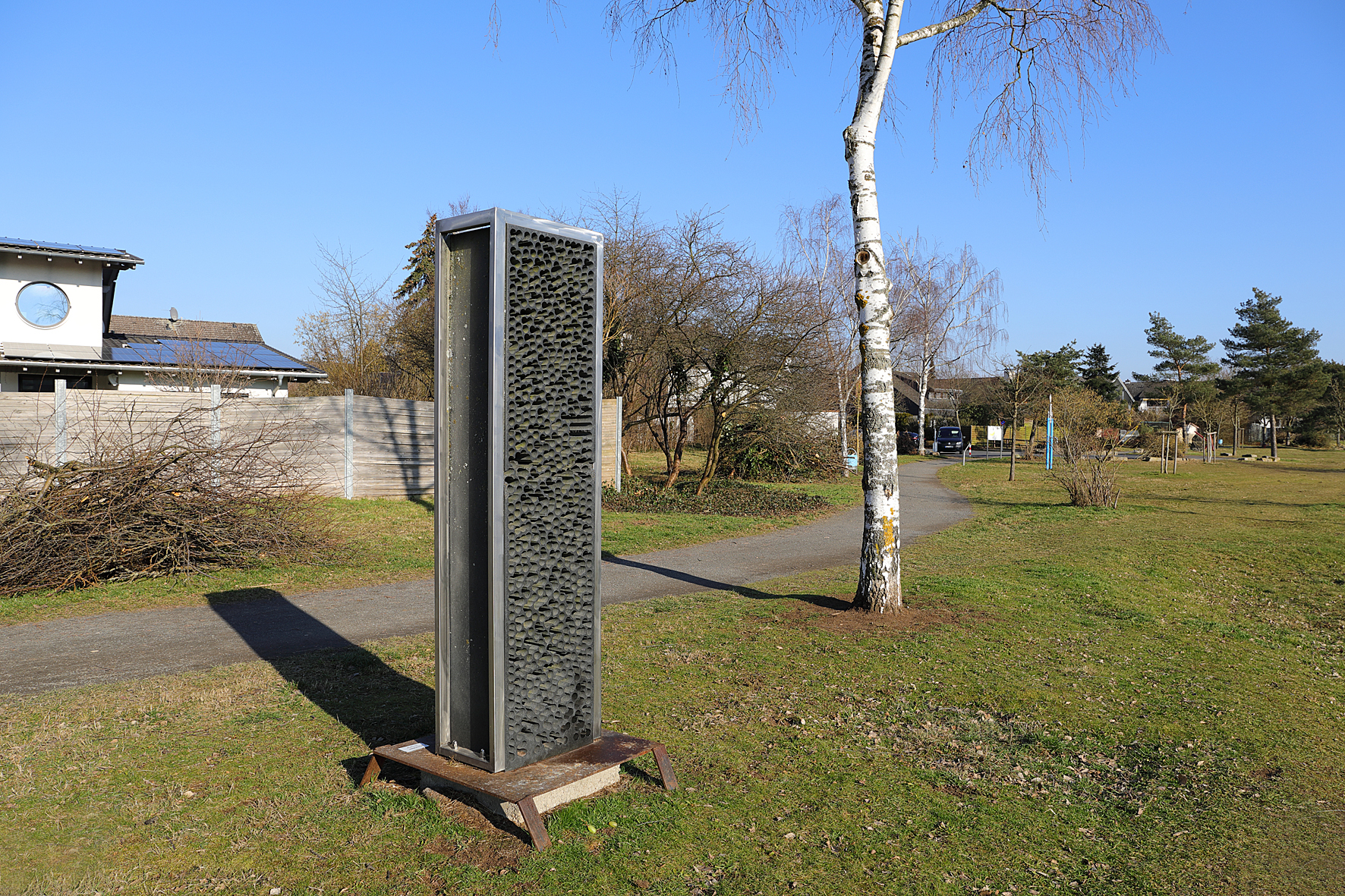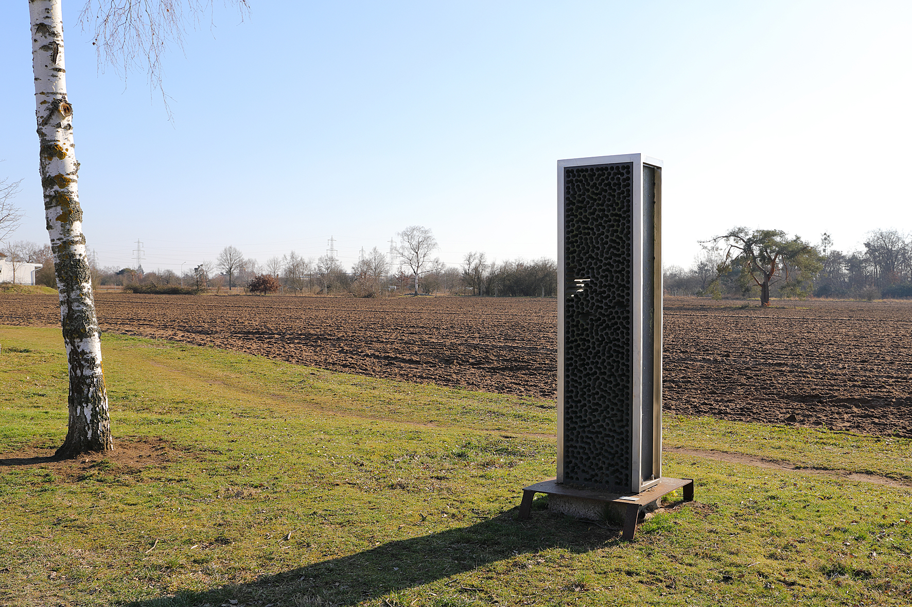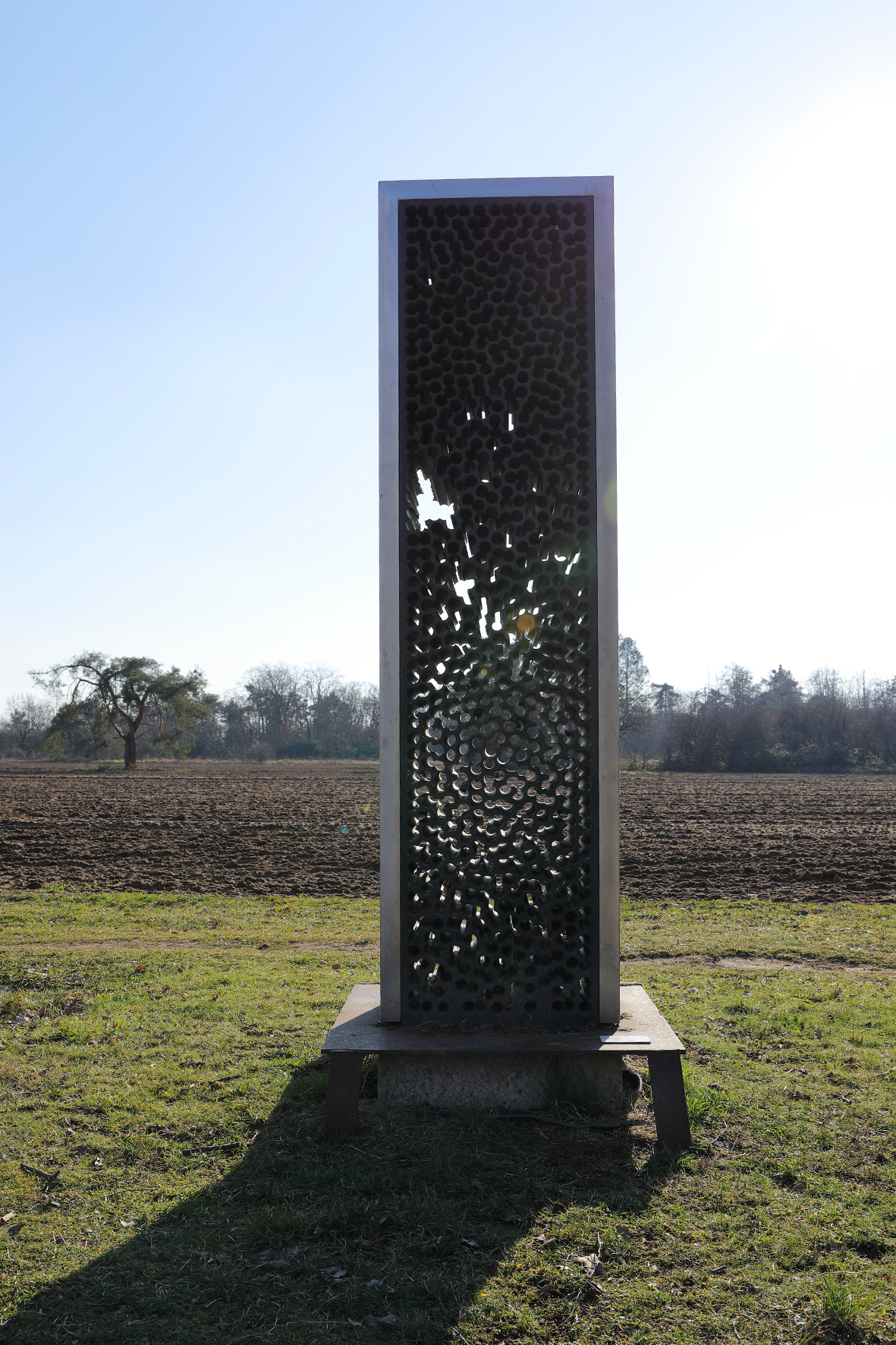Wie ein Gitter aus molekularen Strukturen setzt sich das schwarze Rechteck gegen den blauen Himmel ab. Gravitätisch, und doch leicht und transparent, ist der "Stein für das Licht“ zwischen Himmel und Erde eingespannt.