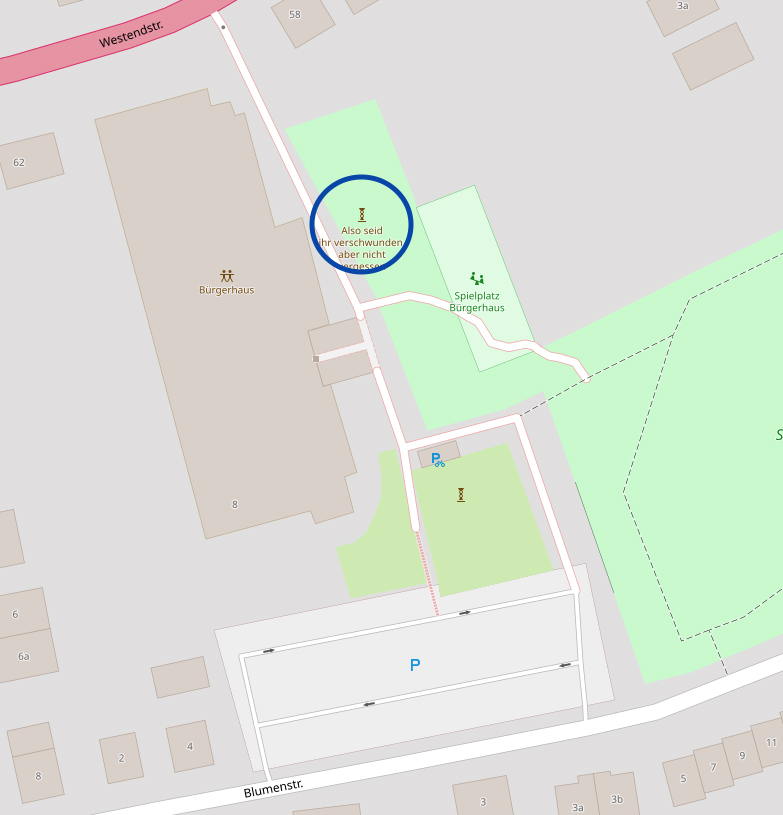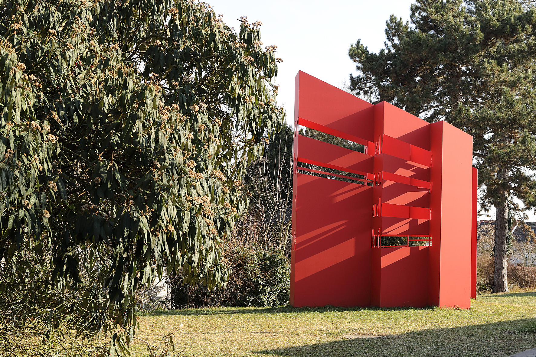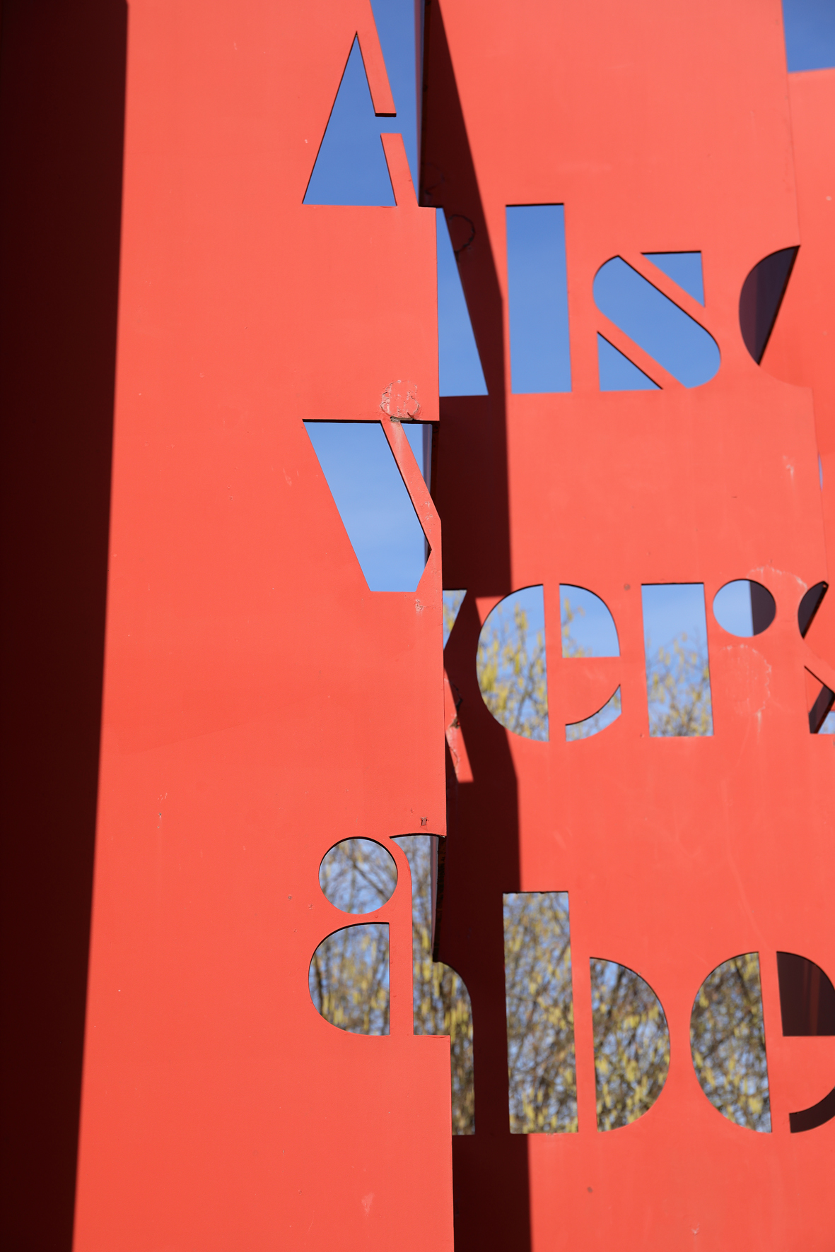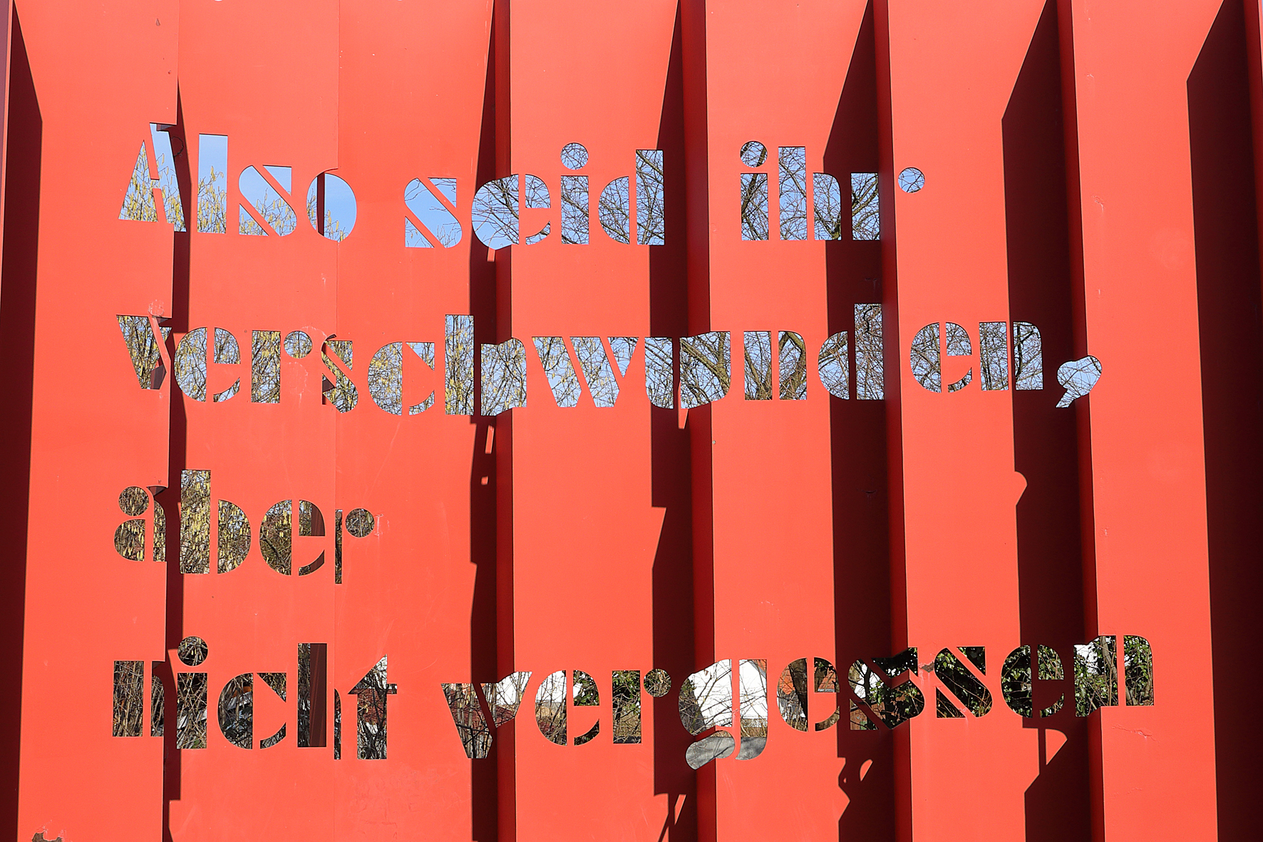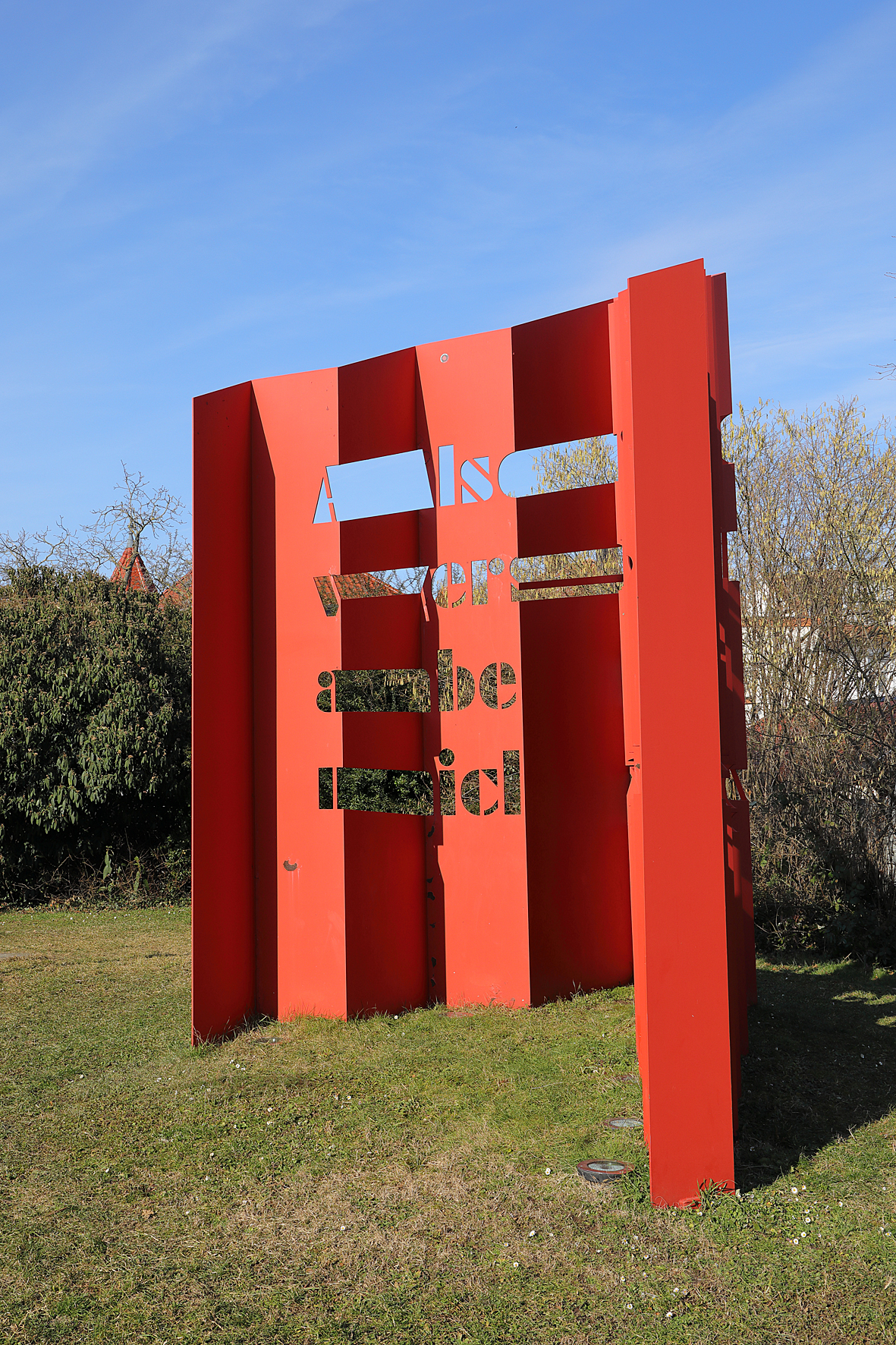 Der Bau des sogenannten "Volkshauses" in den späten 1920er Jahren war ein außergewöhnliches Beispiel sozialen Engagements - Initiative und Selbsthilfe eines “Vereins zur Errichtung eines Arbeitervereinshauses”. Der Entwurf eines “anonymen” Architekten im Geist und Stil der konstruktivistischen Moderne war Grundlage für eine architektonische Besonderheit von außerordentlicher Qualität. 2002 beantragte die DKP-Fraktion in der Stadtverordnetenversammlung von Mörfelden-Walldorf, vor dem erneuerten Bürgerhaus ein Denkmal zu errichten, das an die Erbauer des Volkshauses - und an ihr Schicksal - erinnert. Es wurde ein Wettbewerb ausgeschrieben, 33 Vorschläge und Entwürfe gingen ein. Schweizer erhielt 2006 den 1. Preis für seinen Entwurf "Also seid ihr verschwunden, aber nicht vergessen" - ein Zitat aus dem Gedicht “An die Kämpfer in den Konzentrationslagern” von Bertolt Brecht, 1933 entstanden. In der Presse war zu lesen: „Die aufgefalteten Seitenteile wirken aus der Perspektive wie rote Fahnen im Wind. Ein Schrei in Rot!“ Die Schrift / der Zeichensatz geht auf Paul Renner 1928 zurück. Realisierung im Auftrag der Stadt 2007.