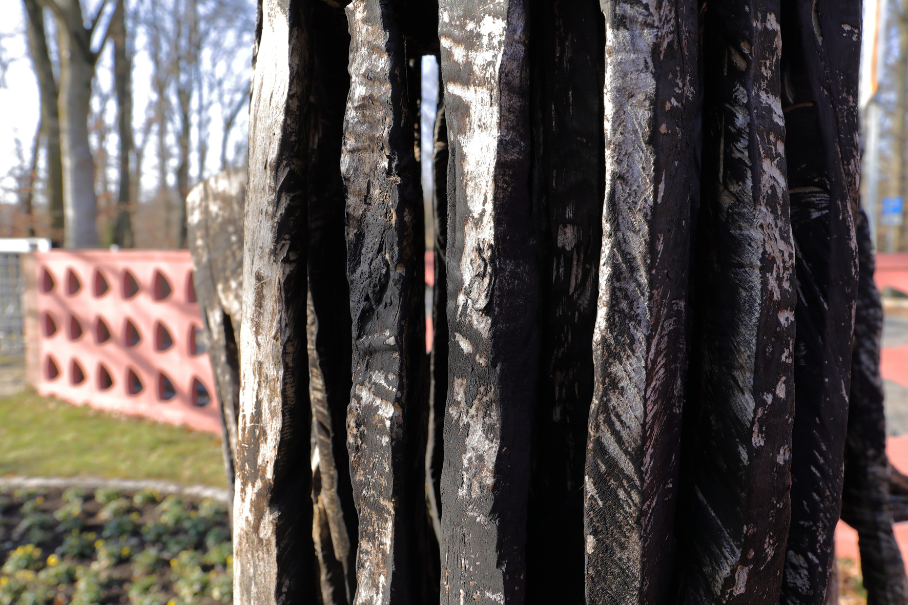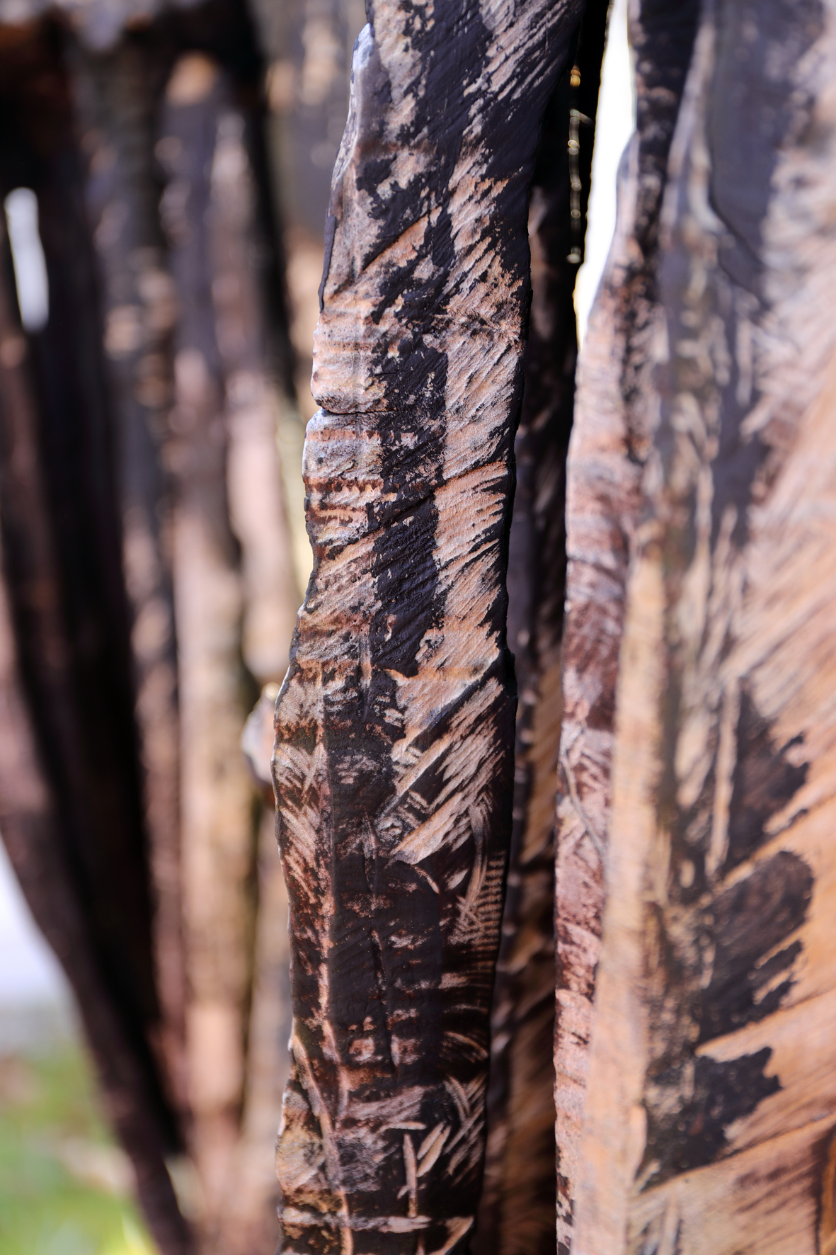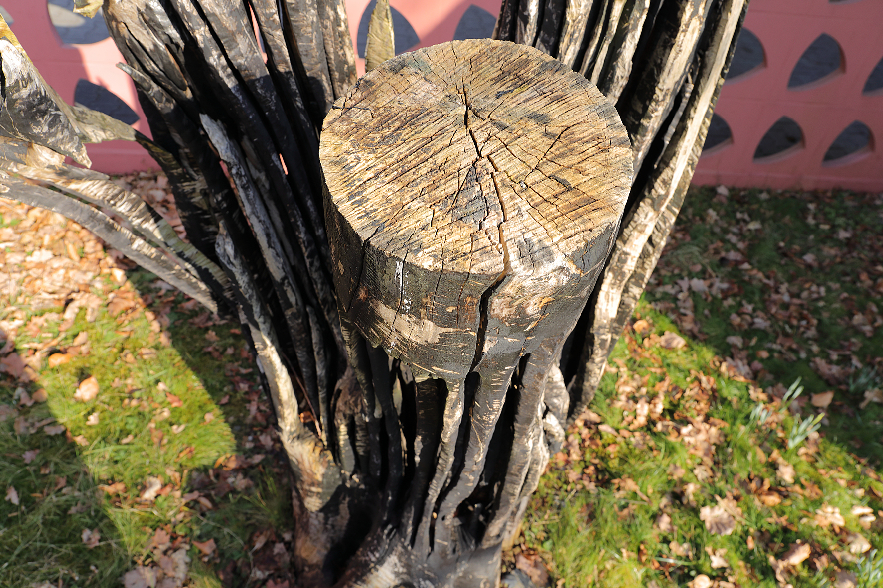 „Diese Arbeit „Stamm durchdrungen” entstand mehr oder weniger durch den Umstand, dass ich von meinem Holzlieferanten einen 4,5 Meter langen Kastanienstamm geliefert bekam, dessen oberes Ende diese Verzweigungen aufwies. Lange habe ich darüber nachgedacht, wie ich mit dieser Vorgabe der Natur, nämlich den letzten zwei verzweigten Metern dieses Stammes, umgehen soll. In meiner eigentlichen bildhauerischen Handschrift meide ich es, mich vom Wuchs eines Baumes inspirieren zu lassen. Ich brauche den neutralen Säulenstamm um meine Vorstellung daraus herauszuschälen.