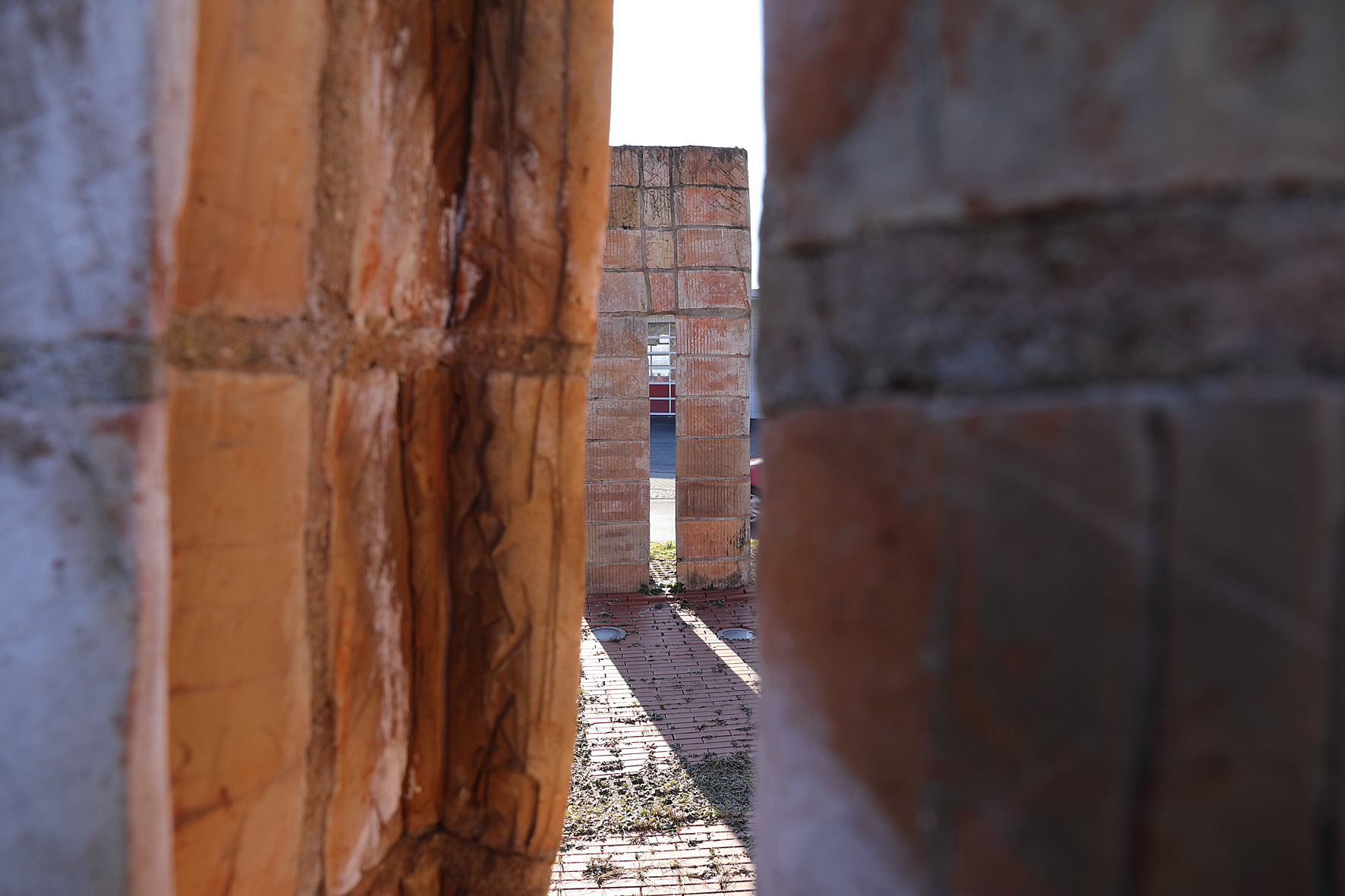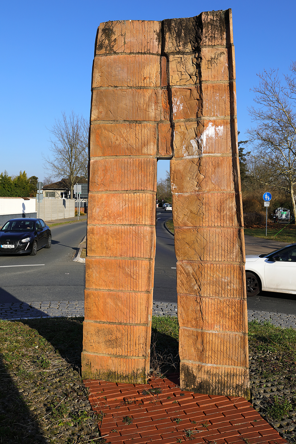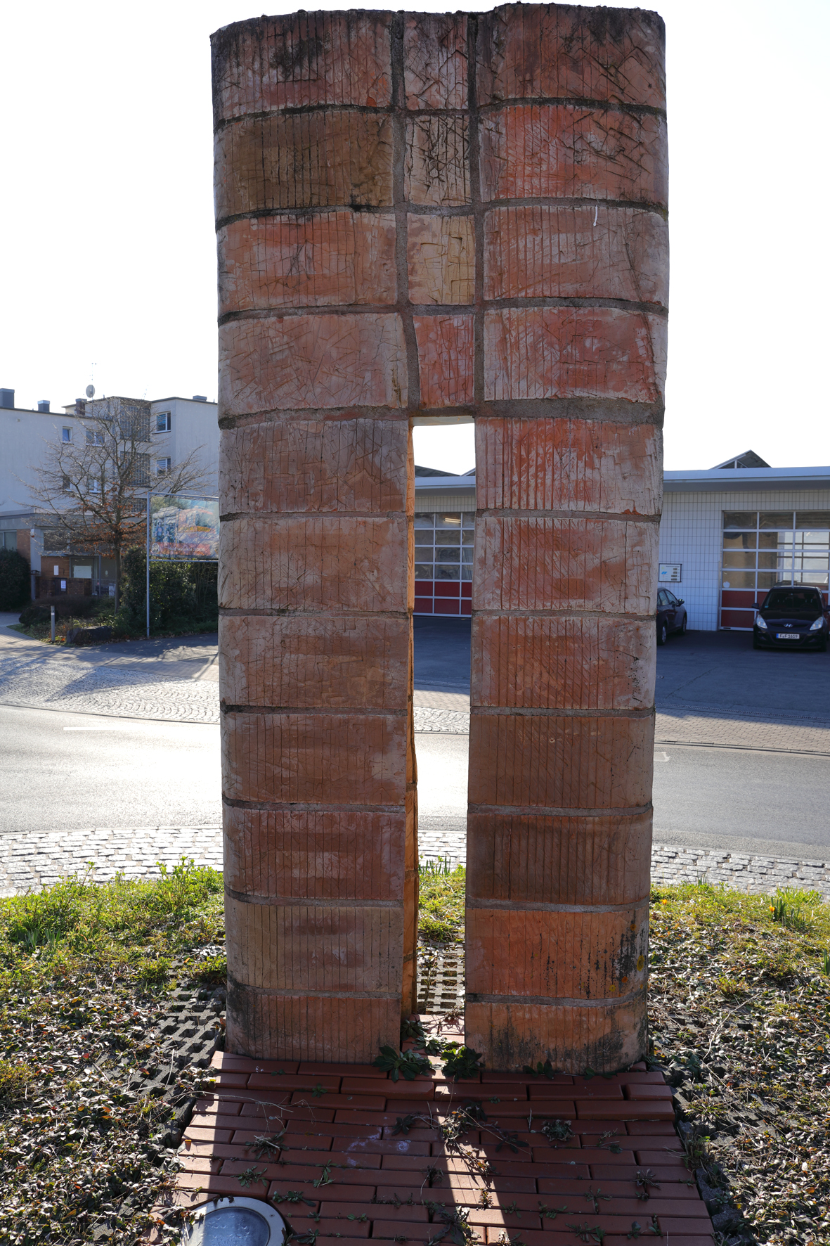 (...) Ein Tor reckt sich und streckt sich wie nach gesundem Schlaf, eins dehnt sich im Fuß, sucht sicheren Halt, eins steht militärisch stramm. Keines der drei ist mit der Messlatte begradigt, und nur wer genau hinsieht bemerkt, wie sich die Kanten aus dem Lot biegen. Sanfte Bewegung macht jedes zum Unikat, wie die Menschen, die hindurchgehen: Keiner gleicht dem anderen. Jedes Tor ist ein Einzelnes aus Vielen, zusammengesetzt aus verformtem Ziegel, aus der Norm getrieben, vertrieben.