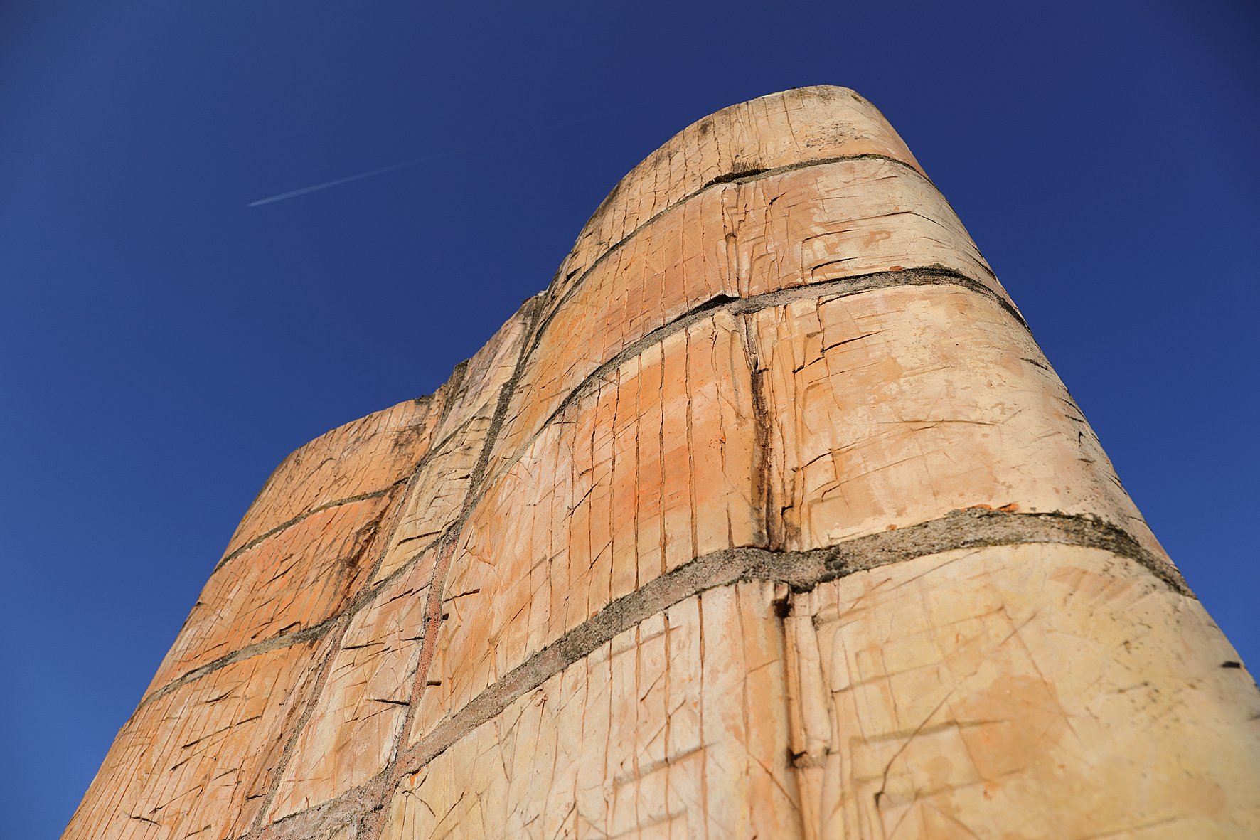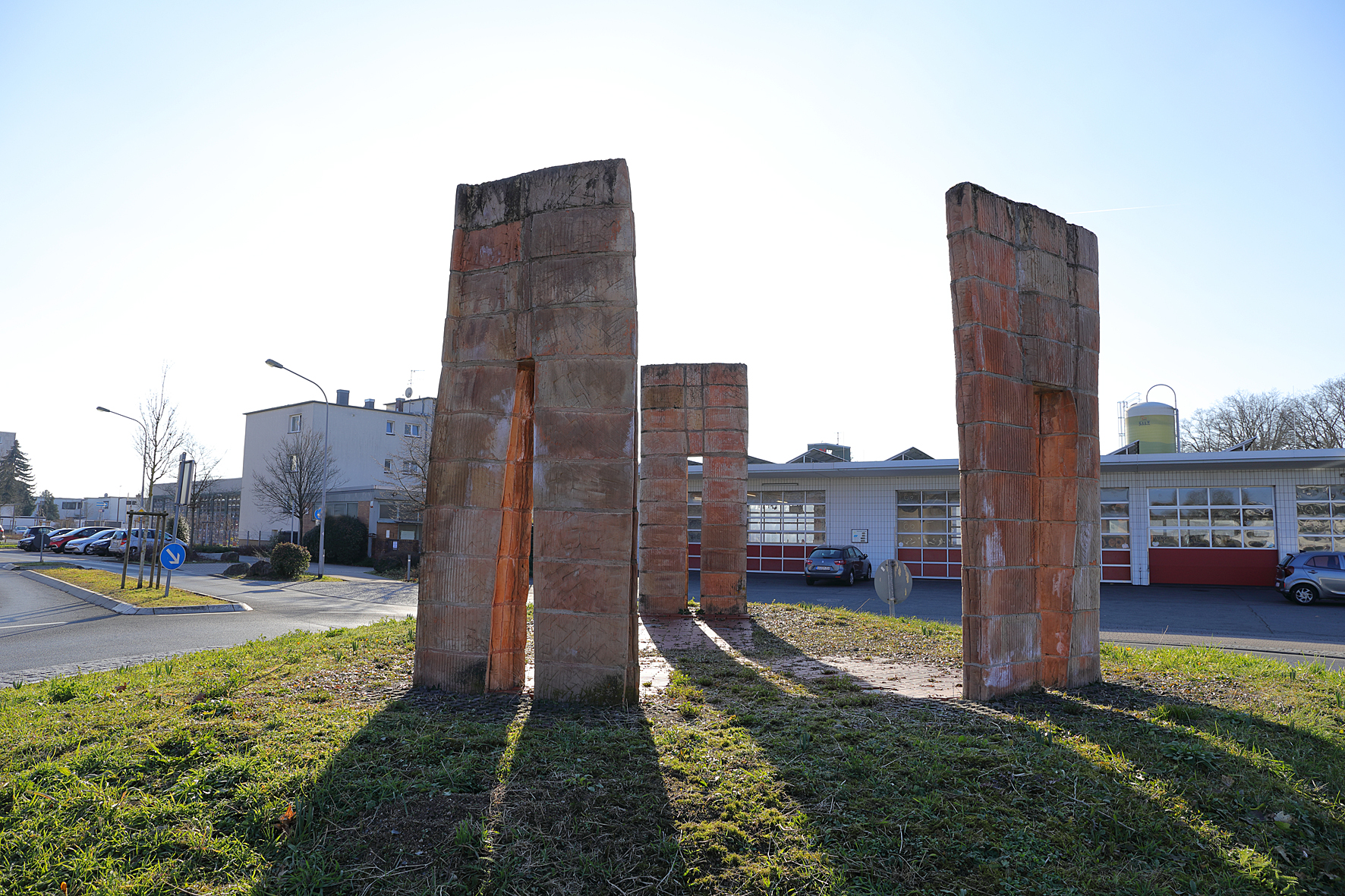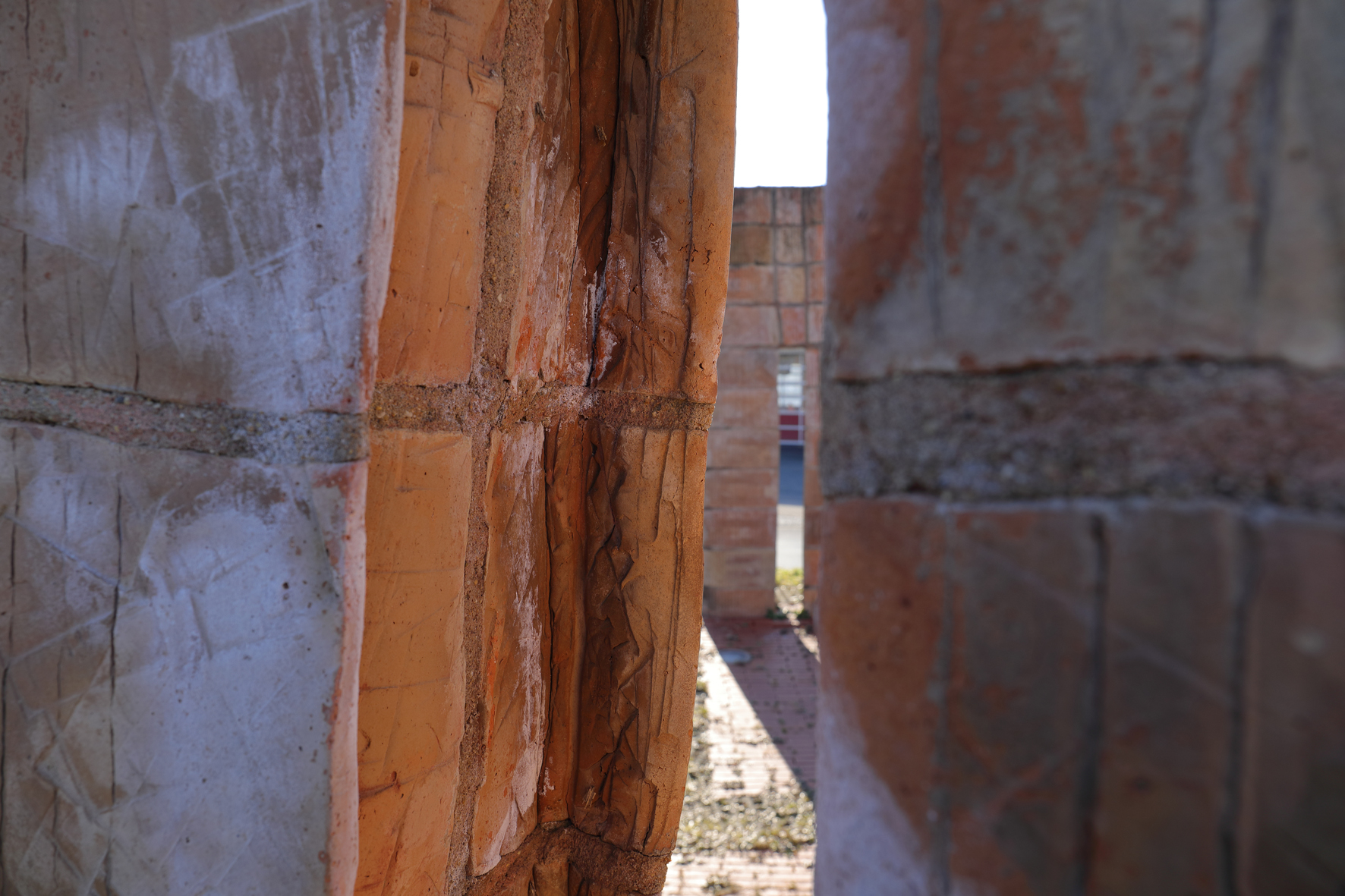 (...) Ein Tor reckt sich und streckt sich wie nach gesundem Schlaf, eins dehnt sich im Fuß, sucht sicheren Halt, eins steht militärisch stramm. Keines der drei ist mit der Messlatte begradigt, und nur wer genau hinsieht bemerkt, wie sich die Kanten aus dem Lot biegen. Sanfte Bewegung macht jedes zum Unikat, wie die Menschen, die hindurchgehen: Keiner gleicht dem anderen. Jedes Tor ist ein Einzelnes aus Vielen, zusammengesetzt aus verformtem Ziegel, aus der Norm getrieben, vertrieben.