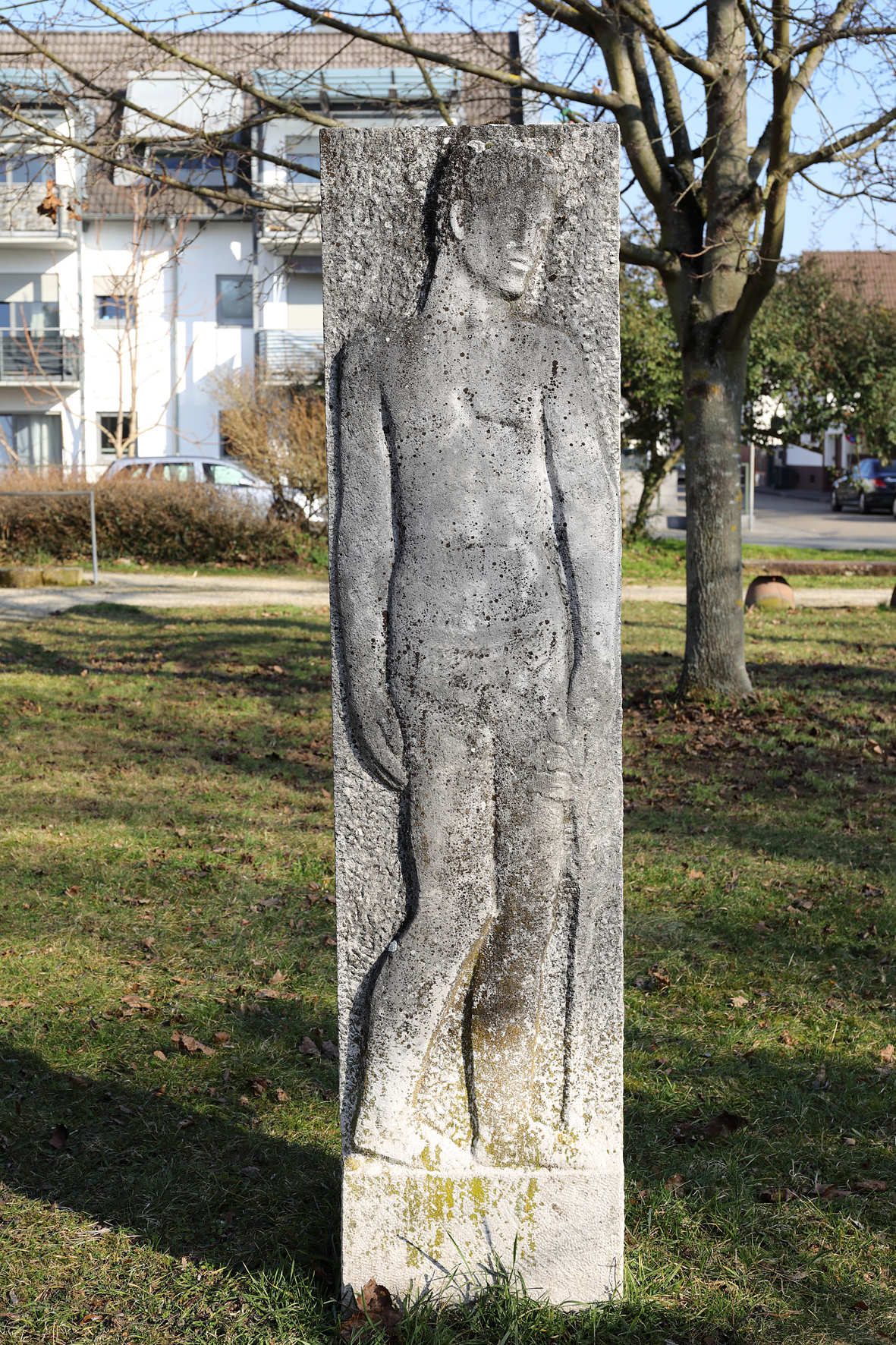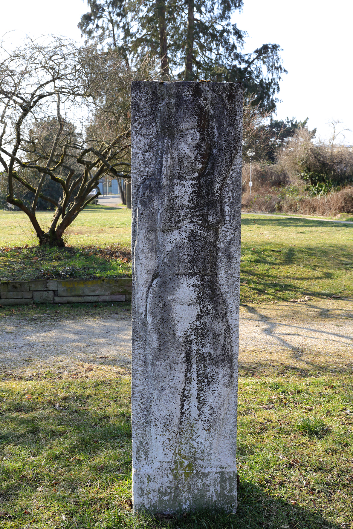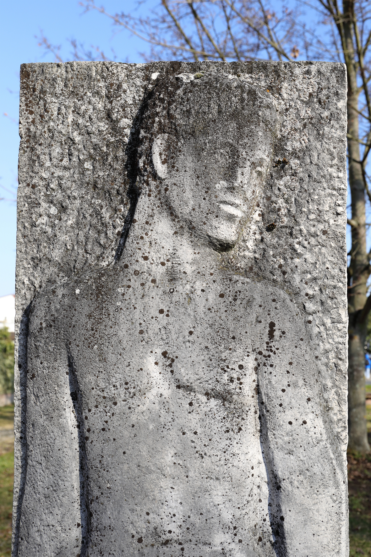 Beidseitig behauene Steinstele mit 2 in Flachrelief gearbeiteten und fast lebensgroßen Darstellungen von einer jungen Frau und einem jungen Mann.